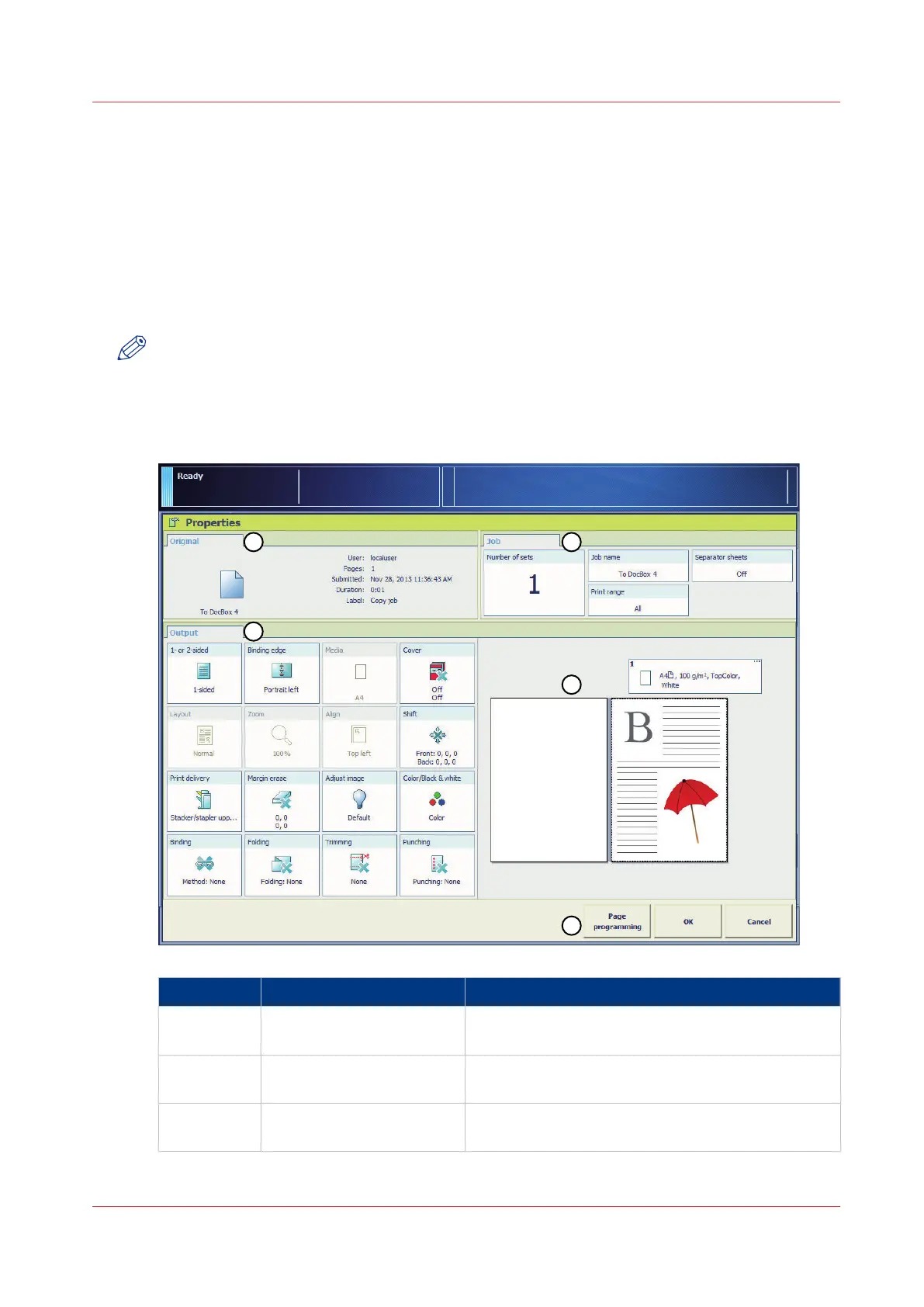 When you select a job in a DocBox and touch [Properties], the current settings of the selected job