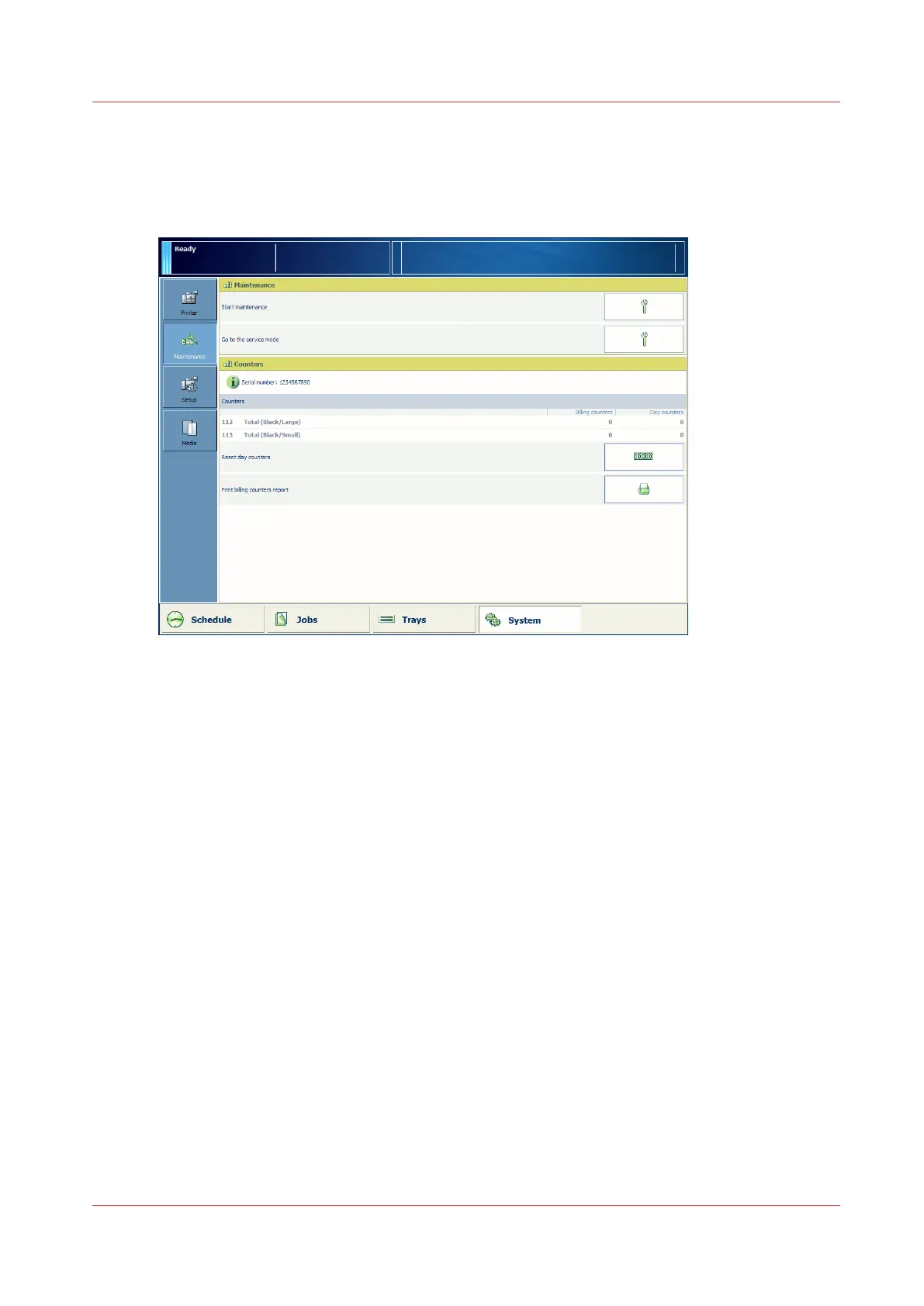 On the control panel, touch [System] -> [Maintenance] -> [Reset day counters].