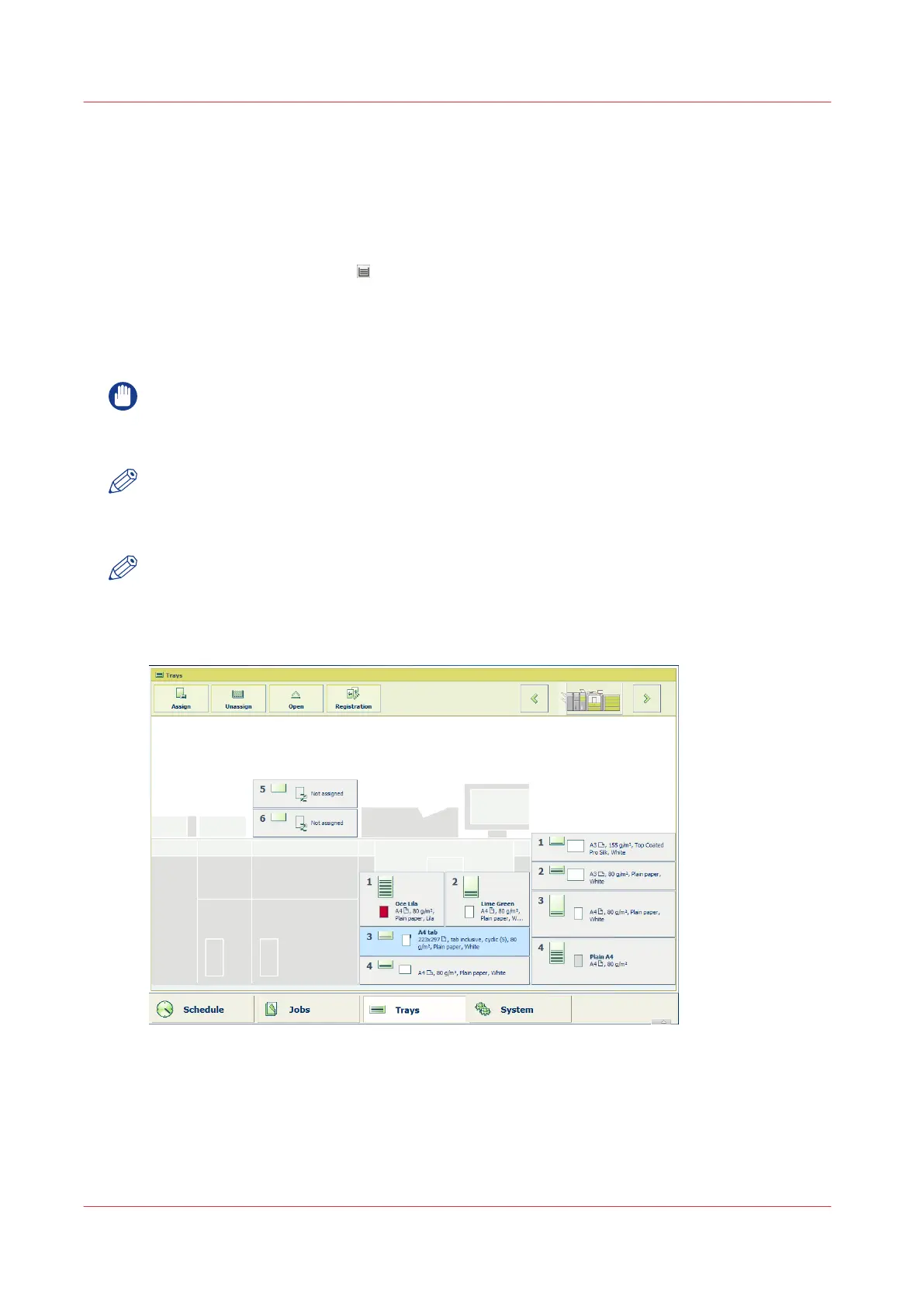 1. Through the softkey for the [Trays] view at the bottom of the control panel.