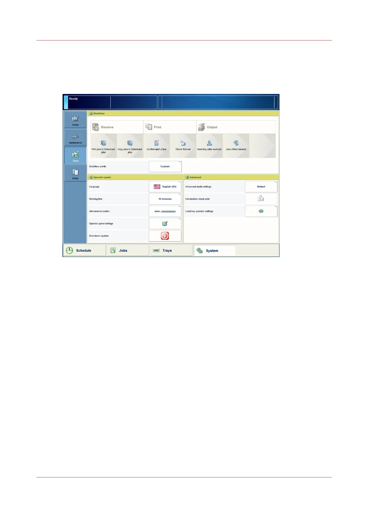 On the control panel, touch [System] -> [Setup] -> [Shut down system].