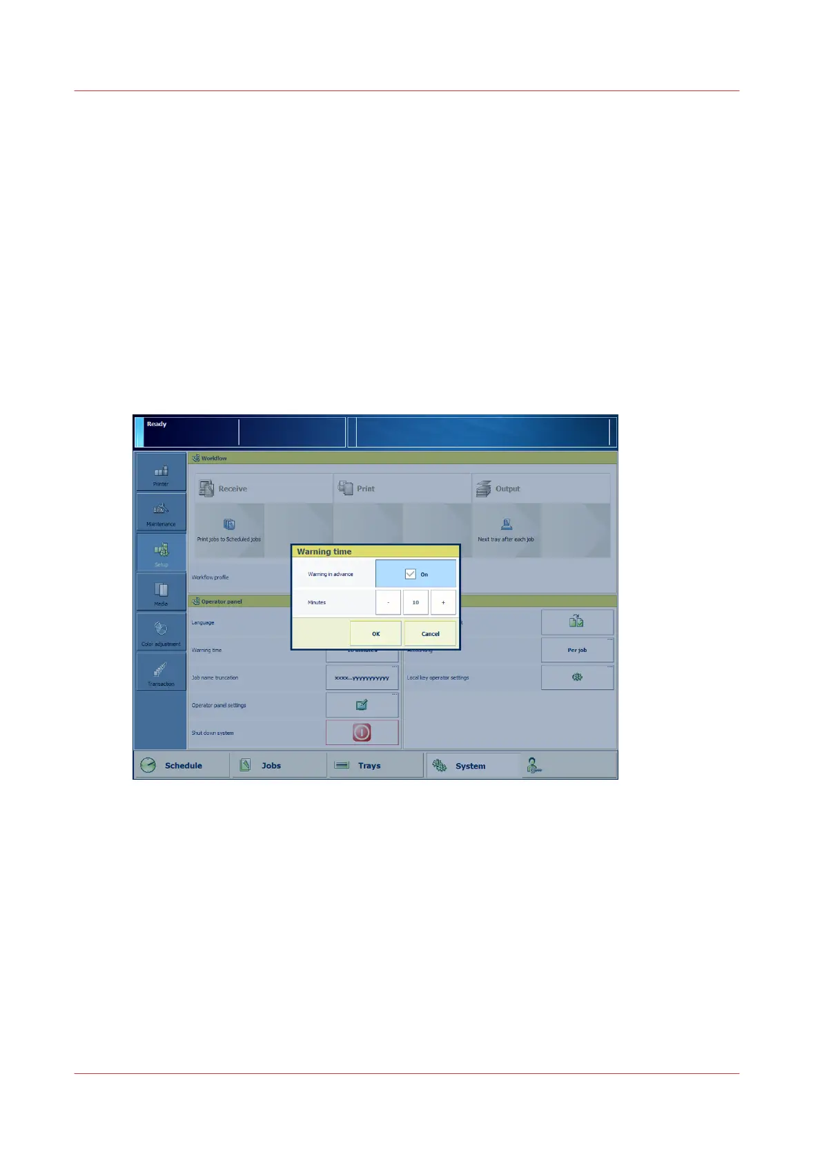 Choose a warning time so that you have sufficient time to prepare media or remove prints