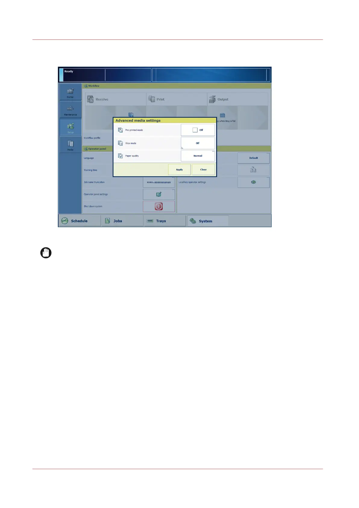 On the control panel, touch [System] -> [Setup] -> [Advanced media settings] (under [Advanced]).