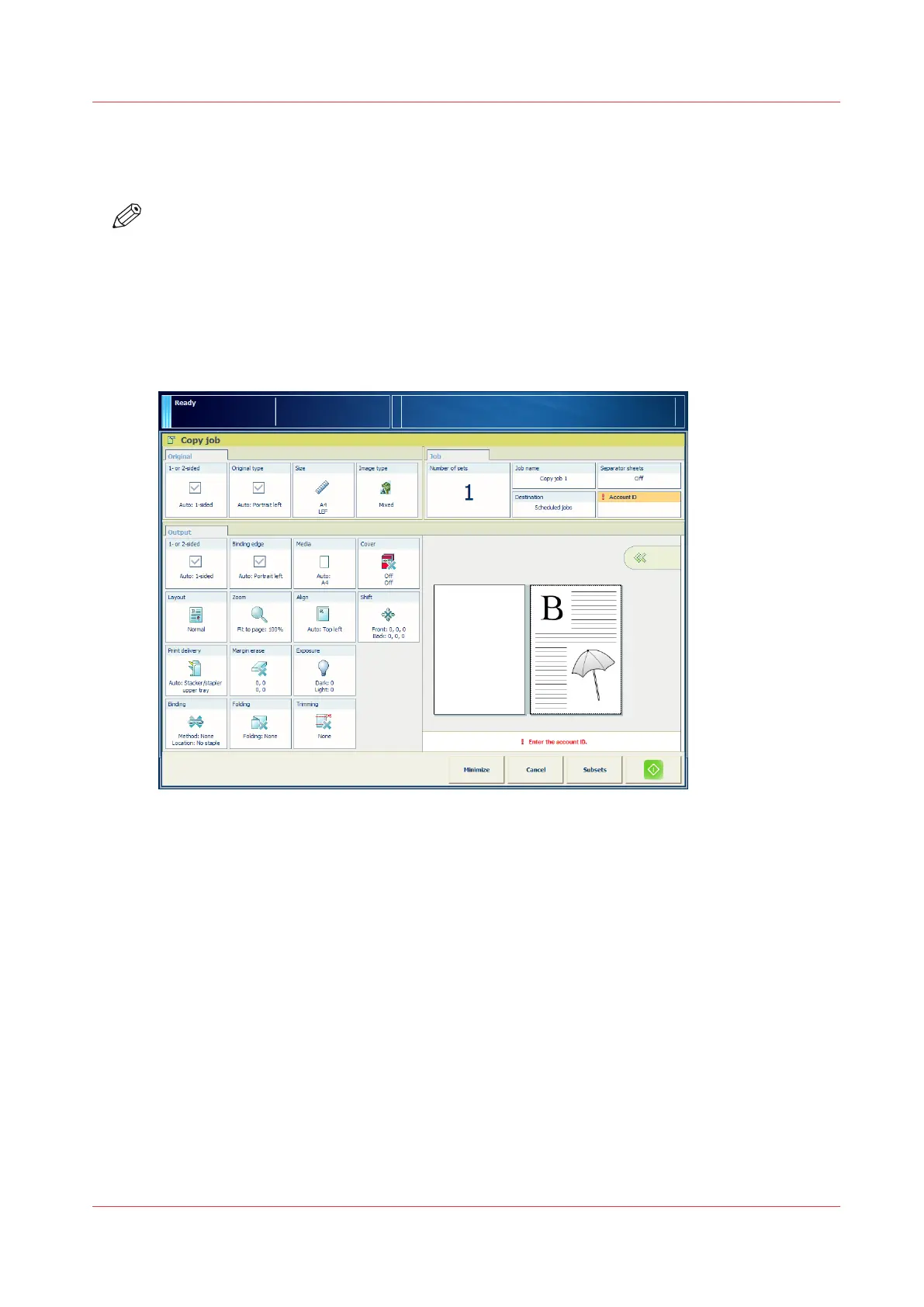On the control panel, touch the [Account ID] button in the [Job] pane of print, copy and scan jobs.