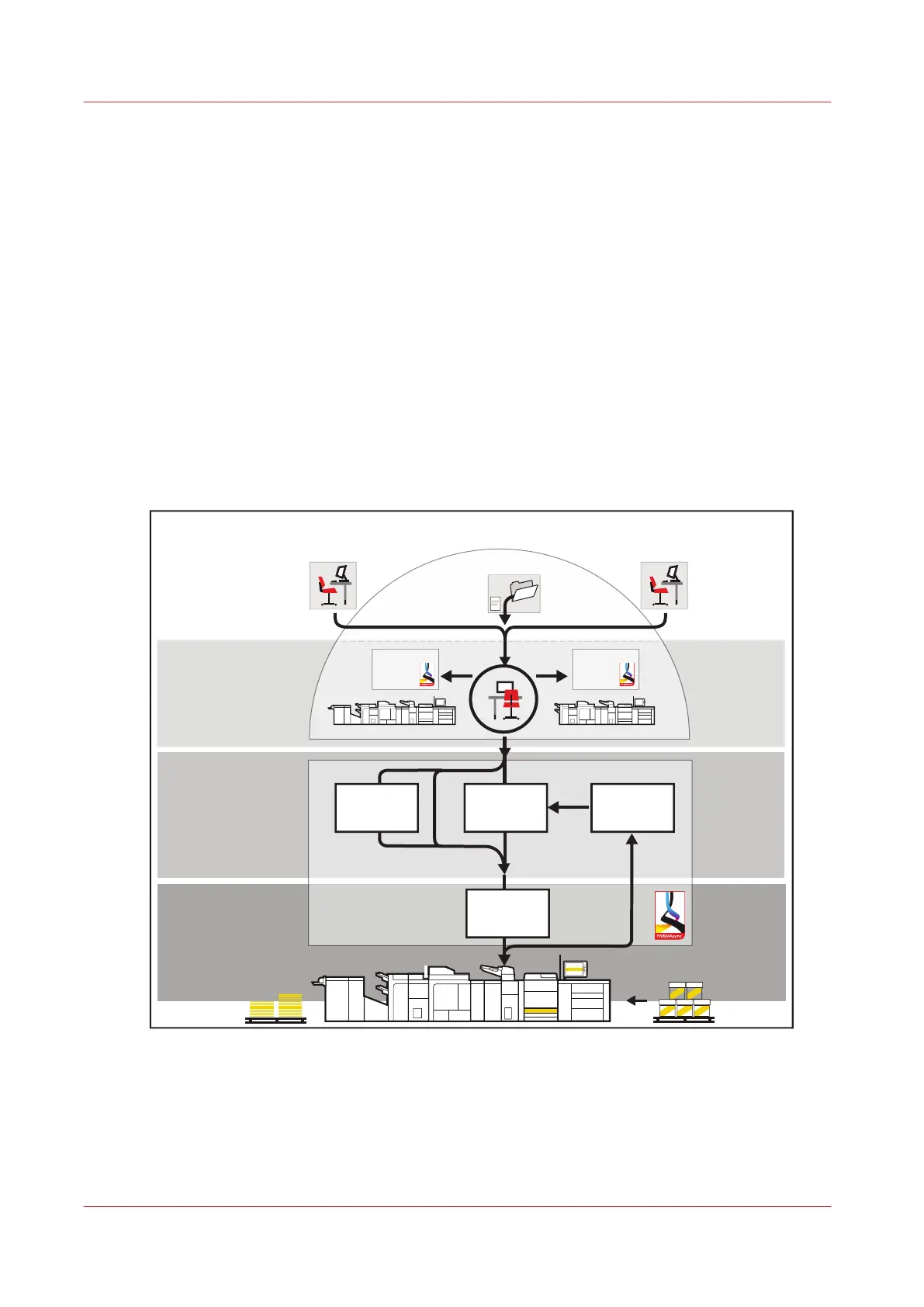 The document printing workflow describes the route from the job preparation to the finishing and