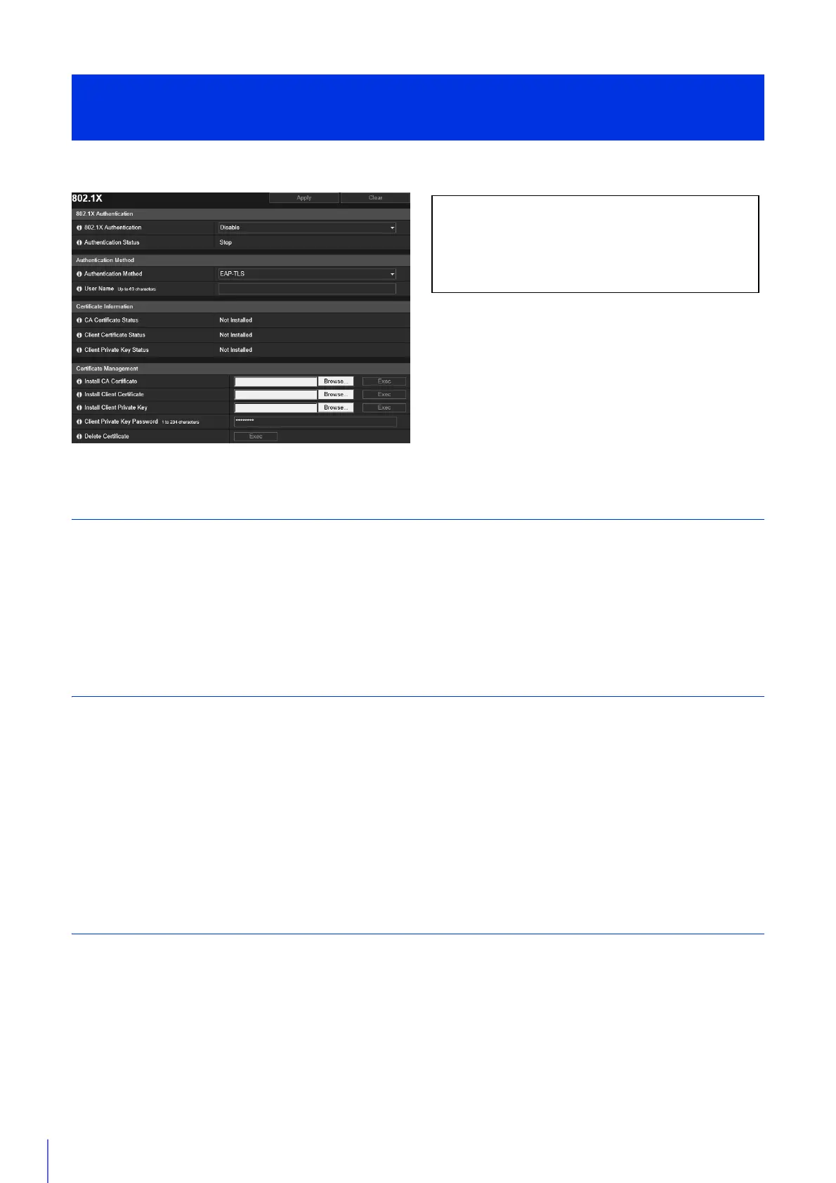Settings for 802.1X authentication and authentication status display, and for certificate management.