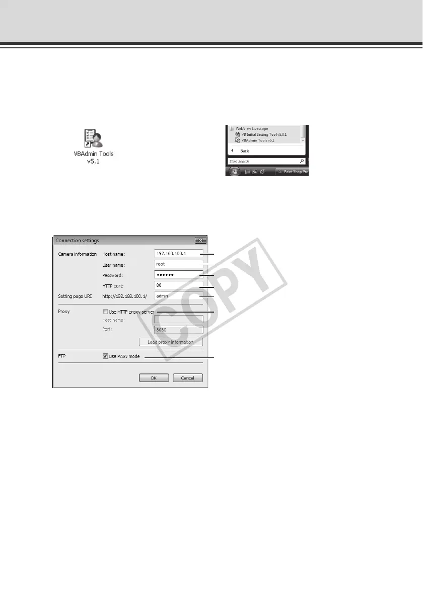 To use VBAdmin Tools, you must connect to the camera first. Enter each item and then click