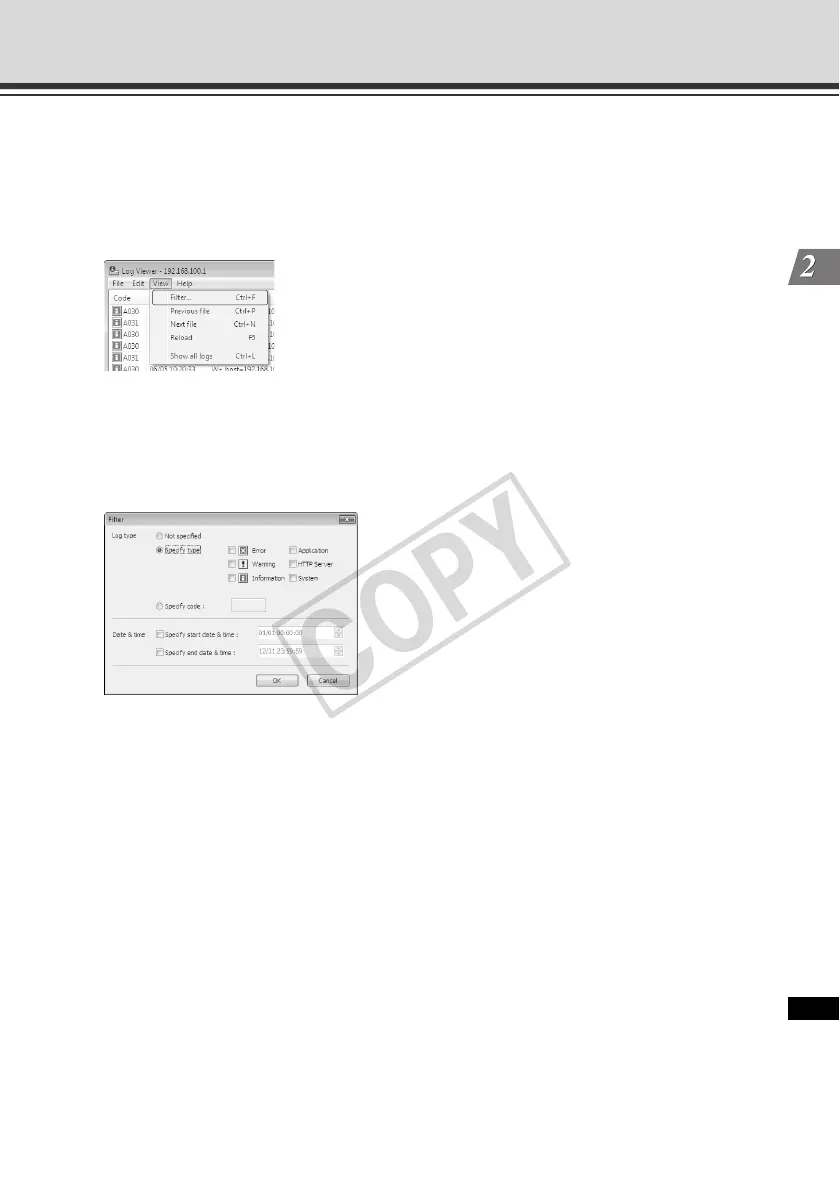 Select the level of logs to be displayed from among [Error], [Warning] and [Information].
