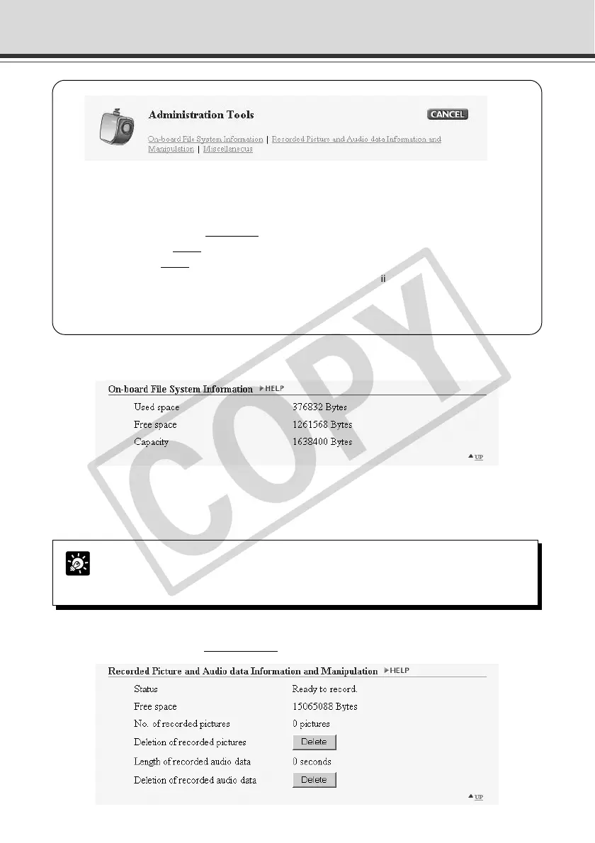● On-board File System Information: Displays the status of VB-C50FSi/VB-C50Fi’s