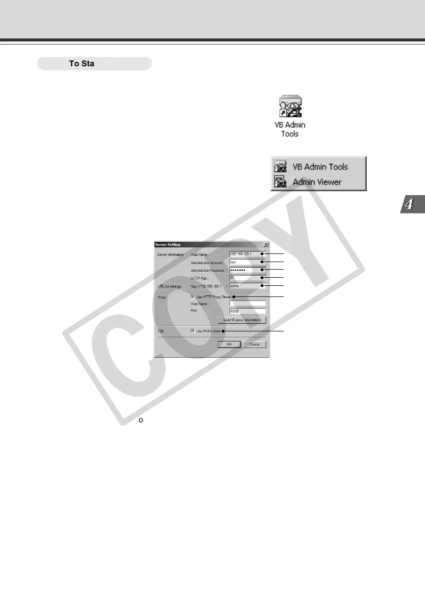 To use VB Administration Tools, it must first be connected to the VB-C50i/VB-C50iR. Enter