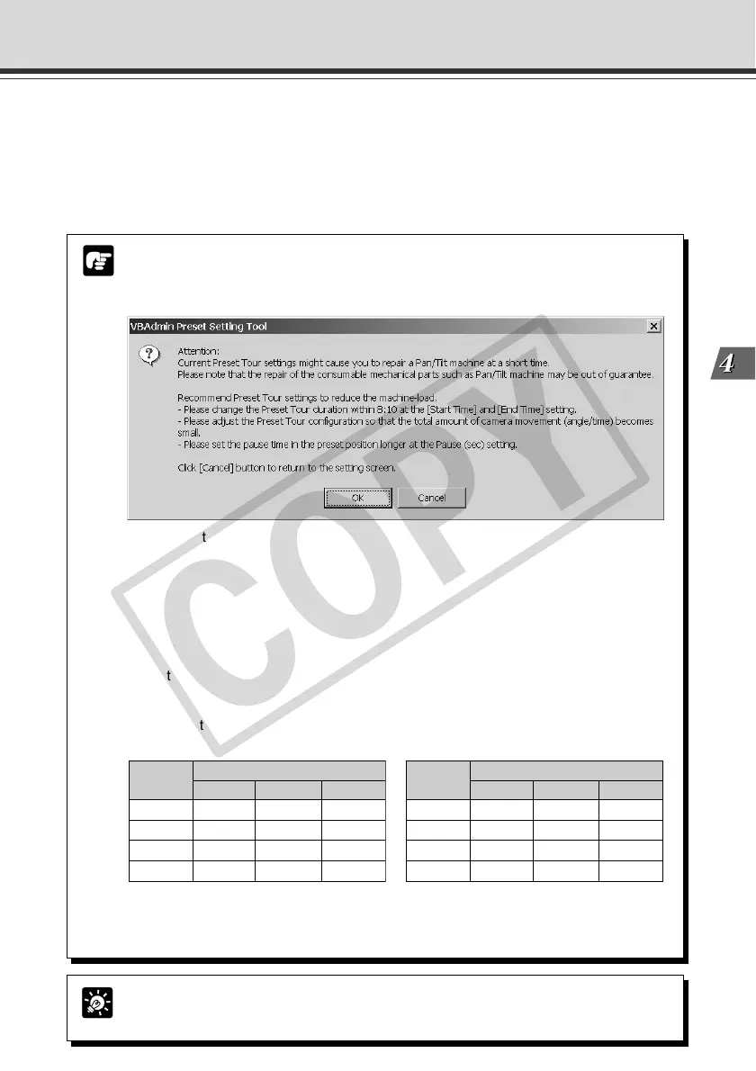 Example: Speed (PT):1, Pause time: 30 seconds, Pan moving range (Angle): ±50°=