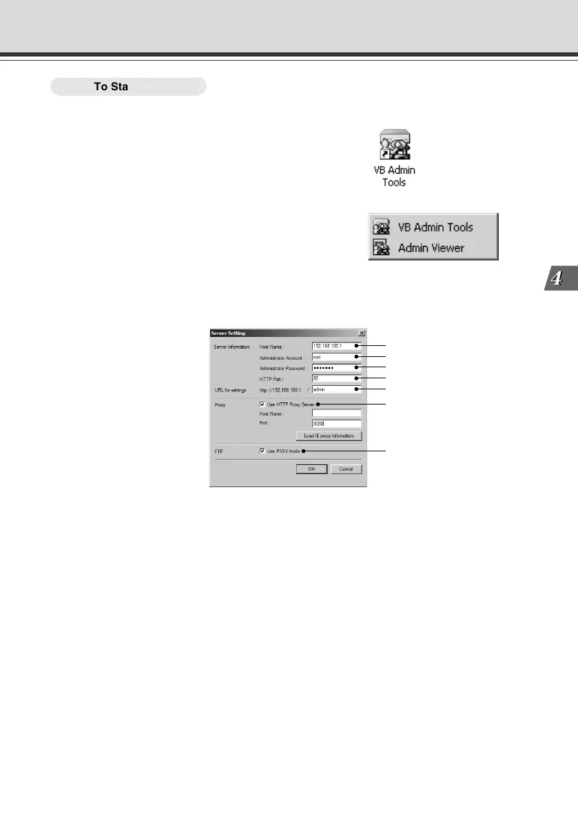 To use VB Administration Tools, it must first be connected to the VB-C50i/VB-C50iR. Enter