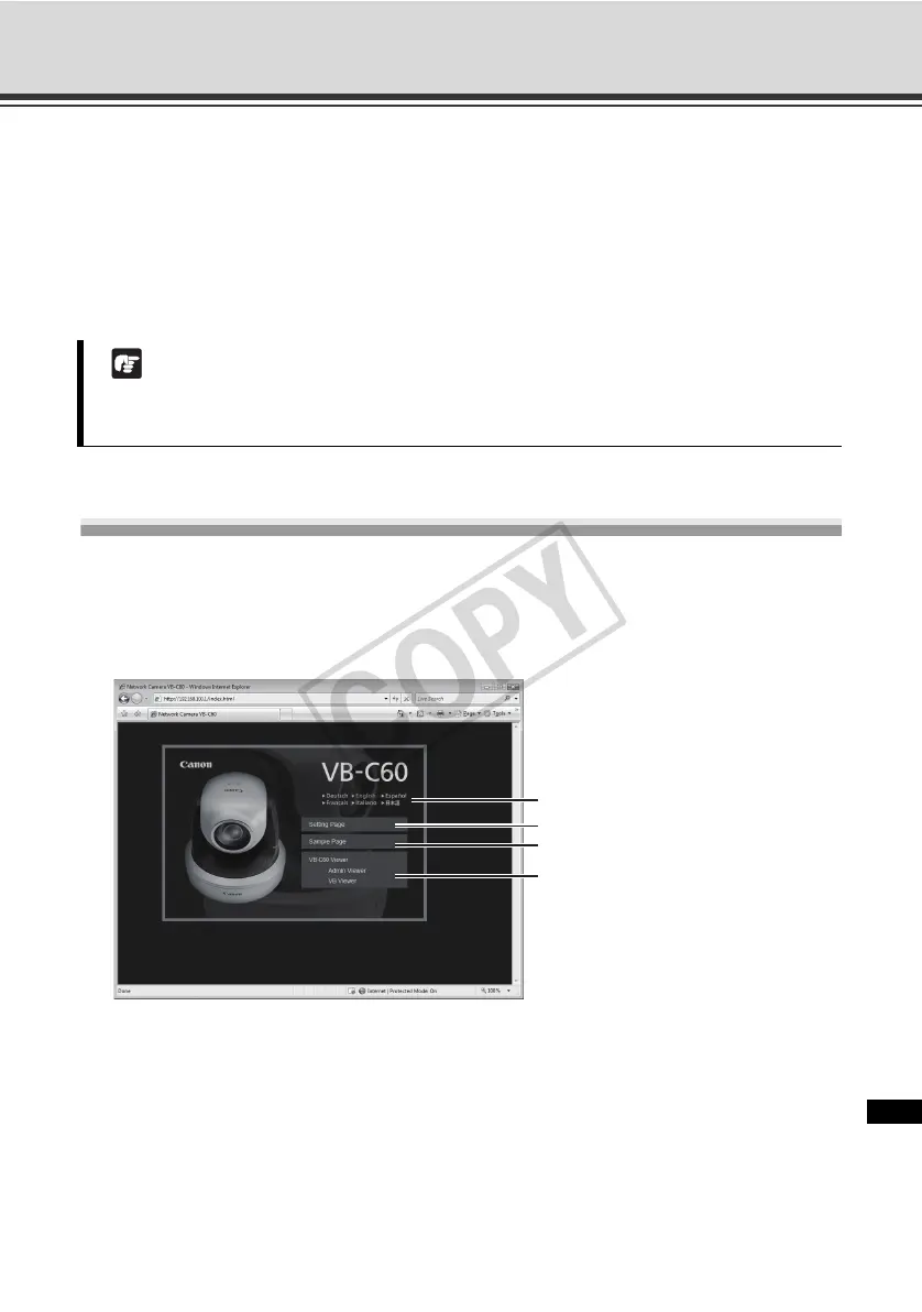 From the top page of the camera, you can access VB-C60 Viewer for displaying images and the