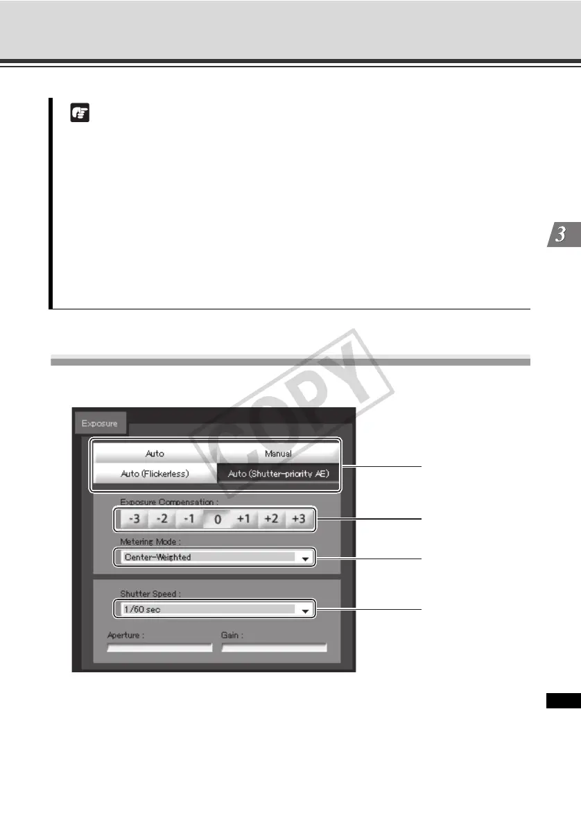 For explanation on each item set in the exposure mode, see the setting page ( P. 1-15).