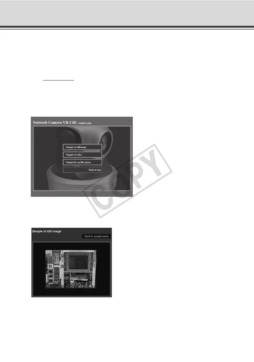This camera stores sample pages for video distribution. You can view the sample pages by