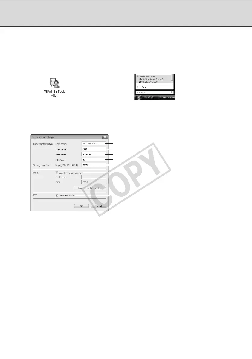 To use VBAdmin Tools, you must connect to the camera first. Enter each item and then click