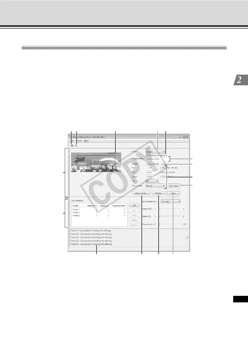 The display screens of Preset Setting Tool are divided into "Preset Setting Area" and "Preset Tour