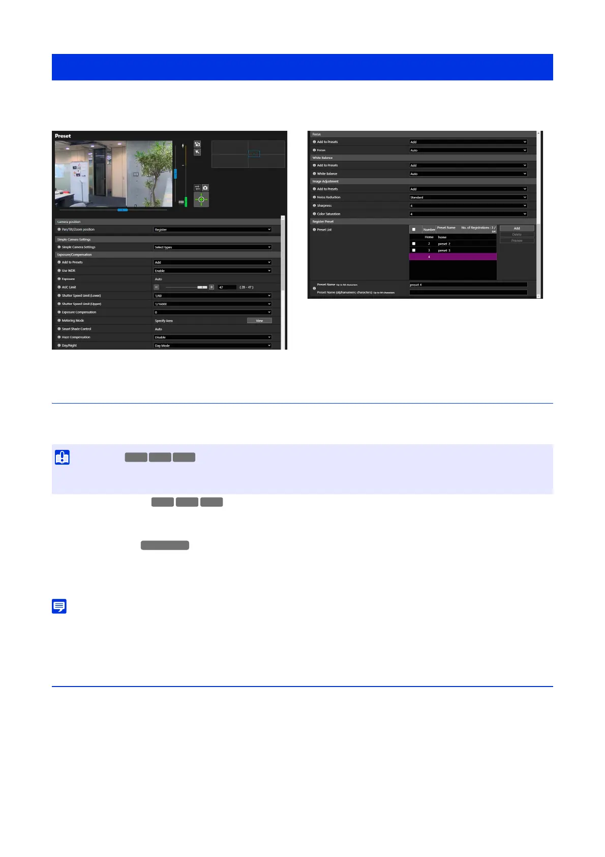 Register the current pan, tilt, and zoom positions as the preset. It is possible to perform pan, tilt, and zoom operations by