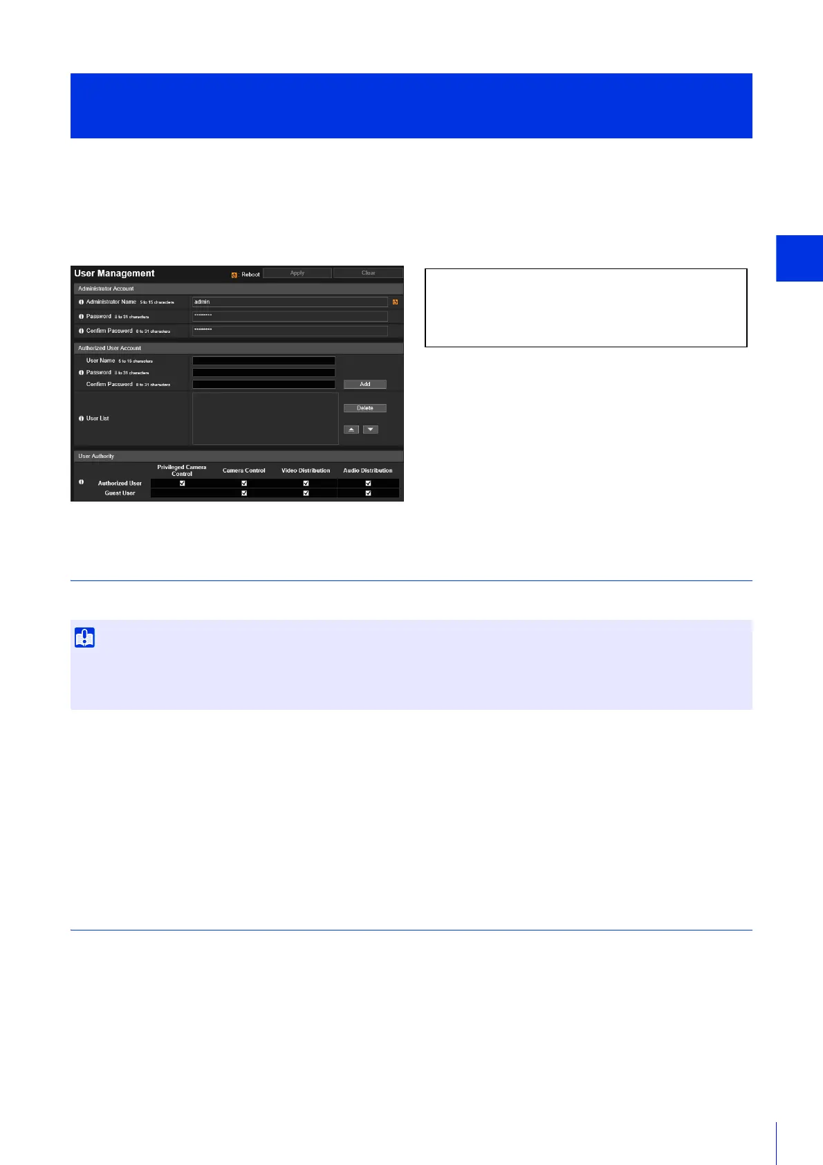You can change the administrator account, add new authorized users, and set the privileges for authorized users and guest