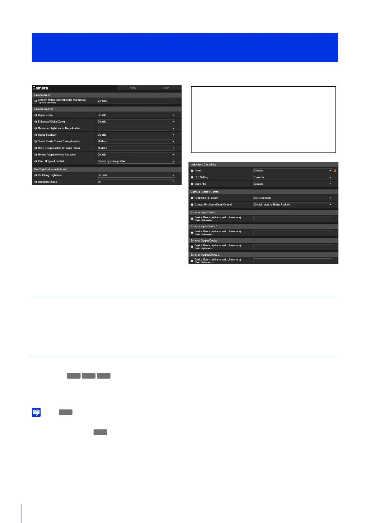 Settings for the camera name and external input/output devices, and for camera use and installation settings.
