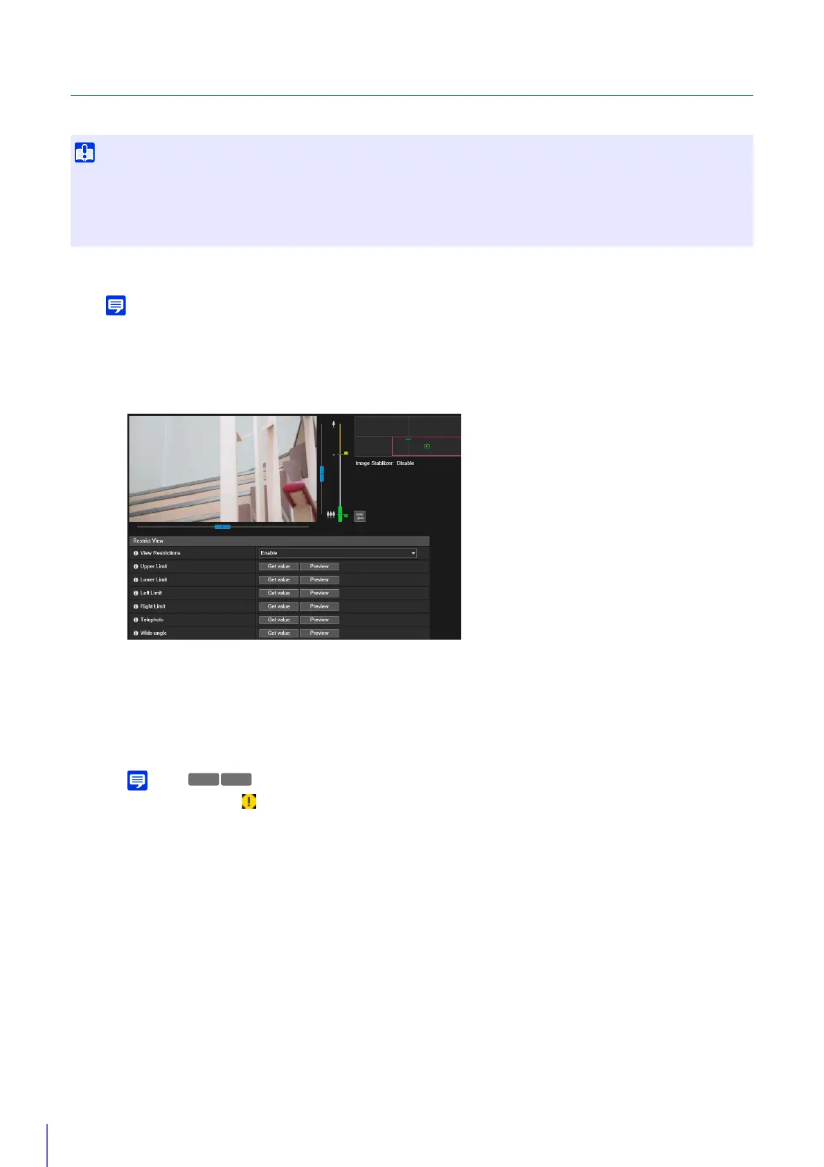 • When [Camera] > [Camera] > [Camera Control] > [Digital Zoom] or [Image Stabilizer] are changed in the setting page, check the view