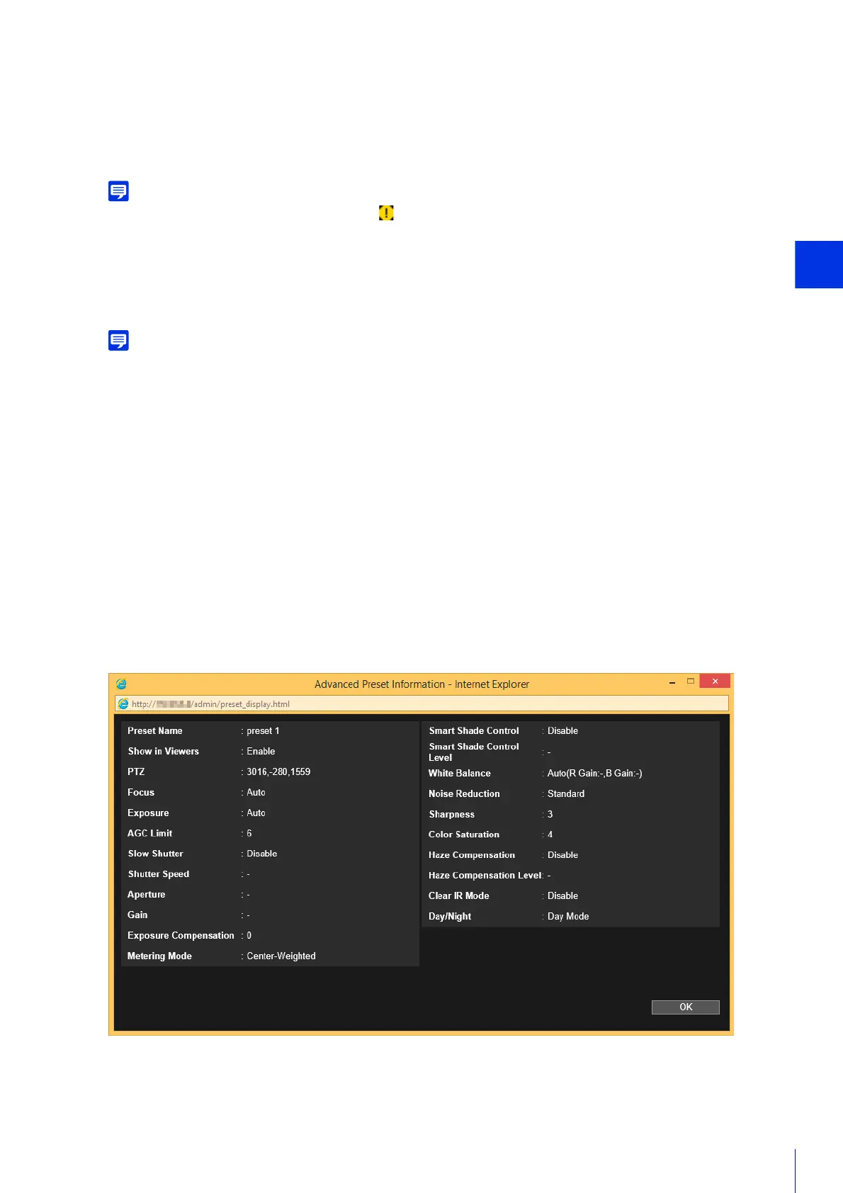 If the preset position is outside the restrict view area, (a warning icon) is displayed on the left.