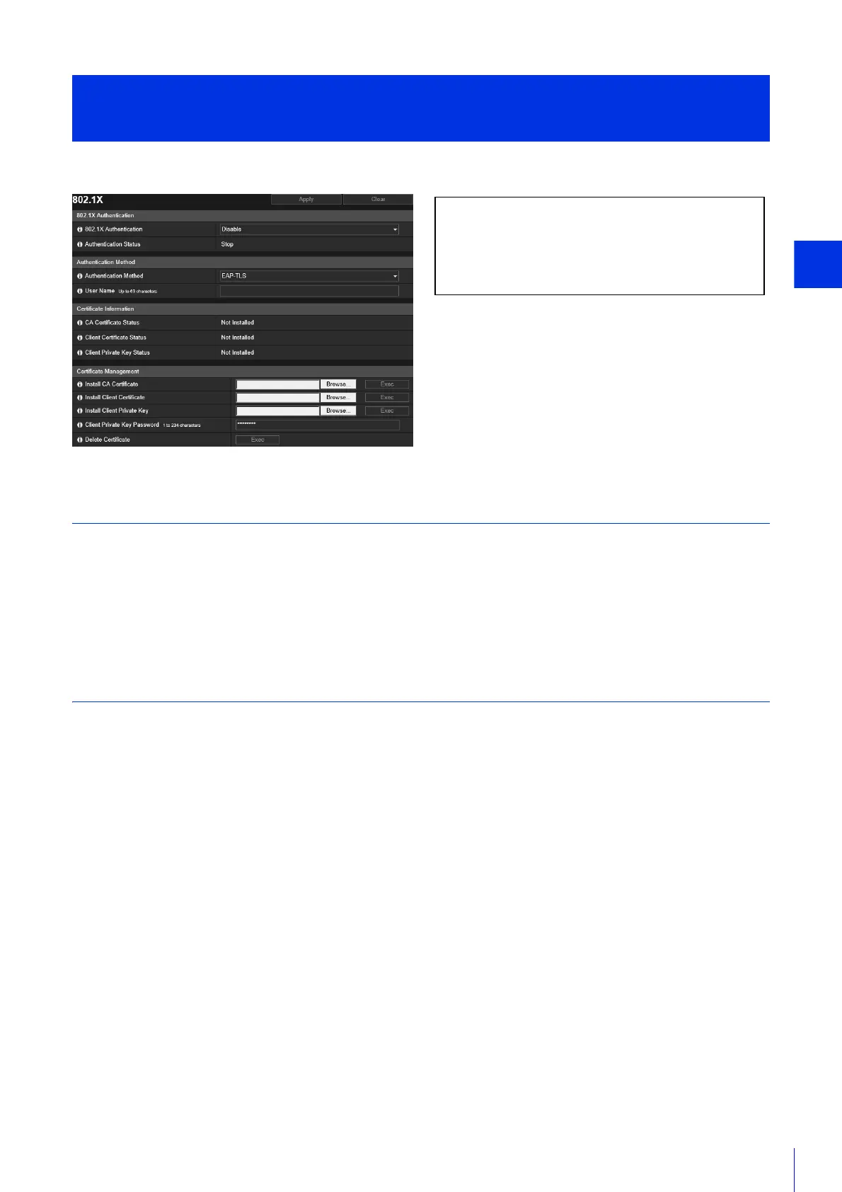 Settings for 802.1X authentication and authentication status display, and for certificate administration.