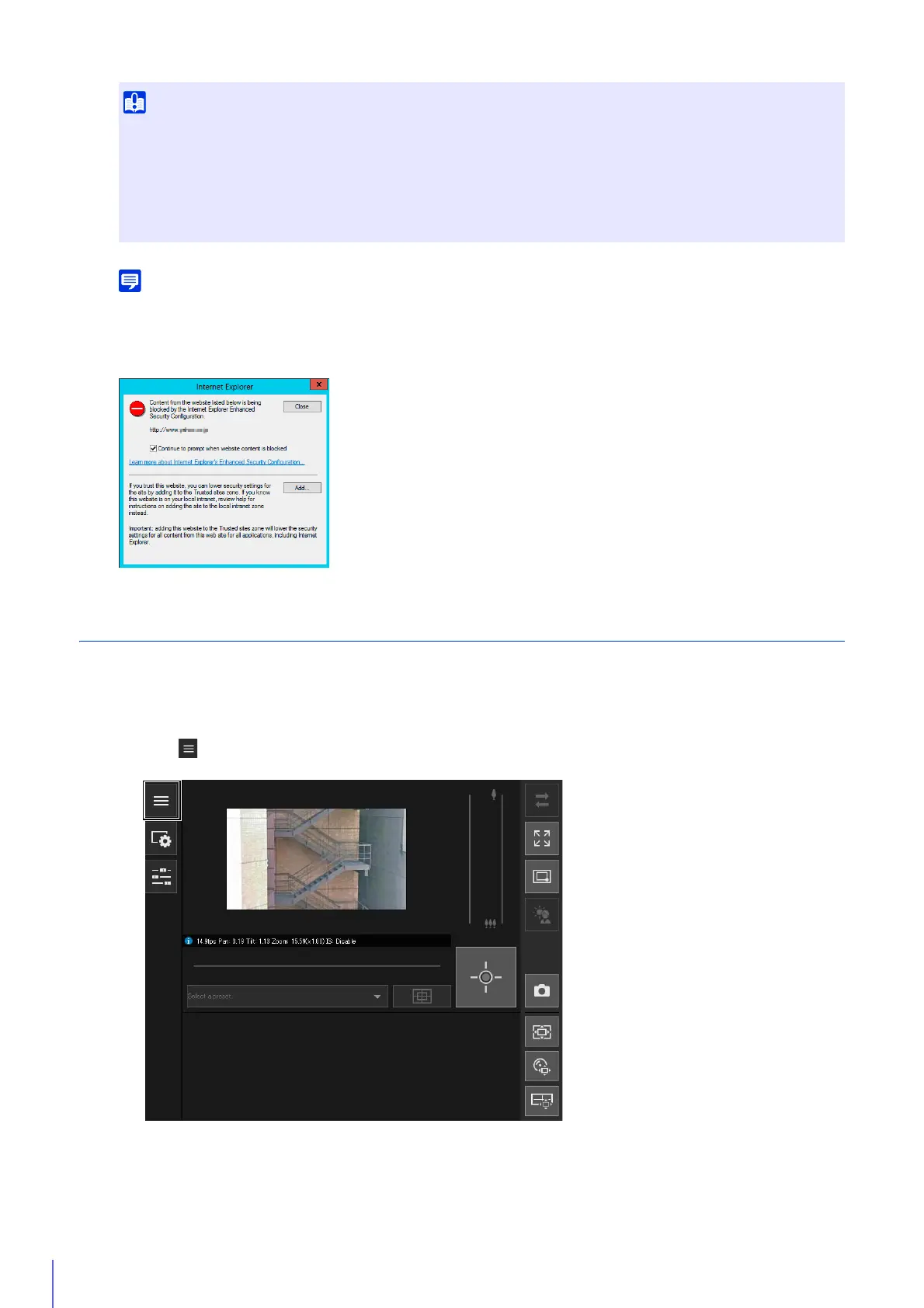 blocked content dialog box may be displayed when attempting to access the Setting Page or the viewer. If this happens, please