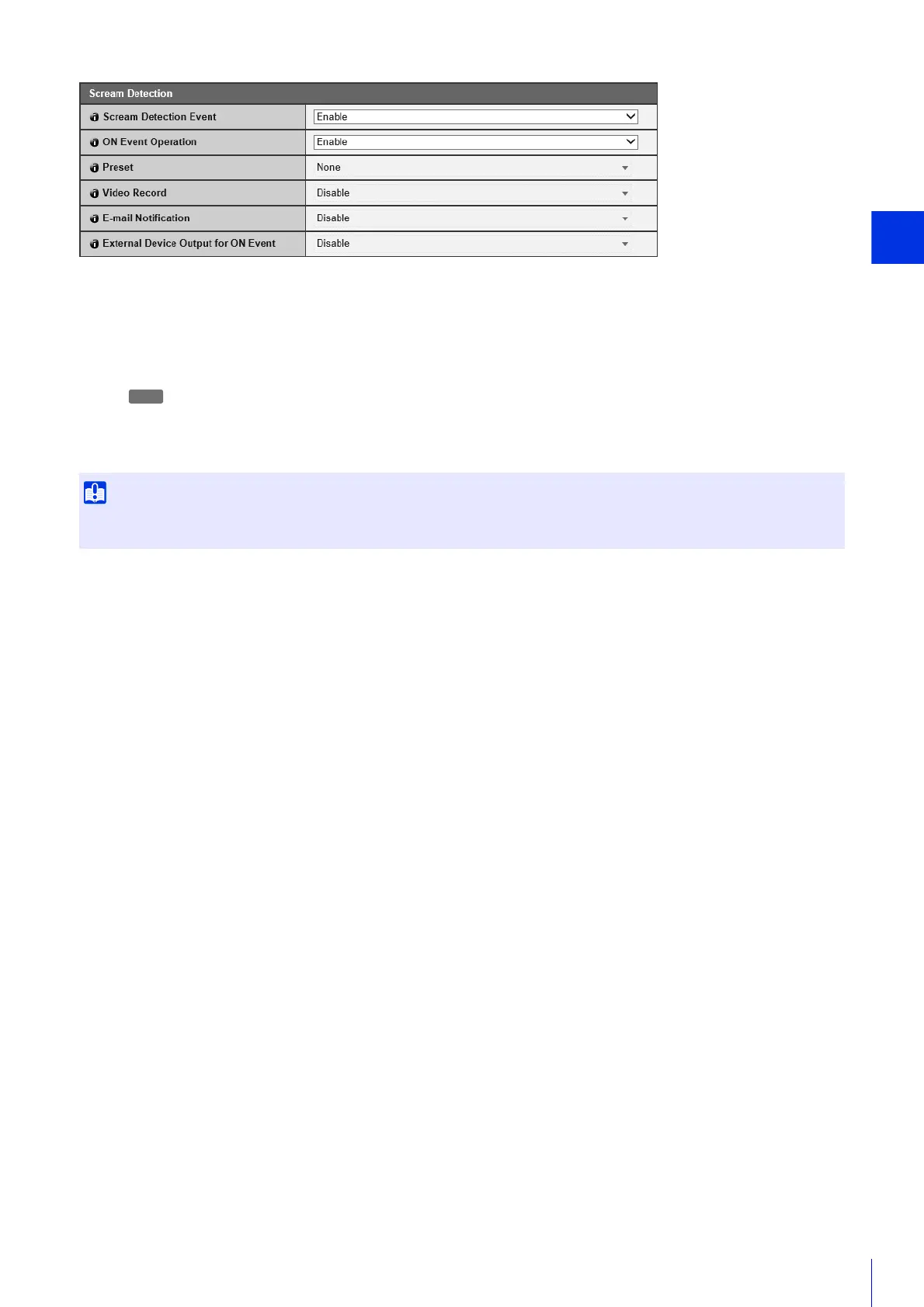If you select [Enable] and a scream detection event is triggered, video will be transmitted to the recording destination
