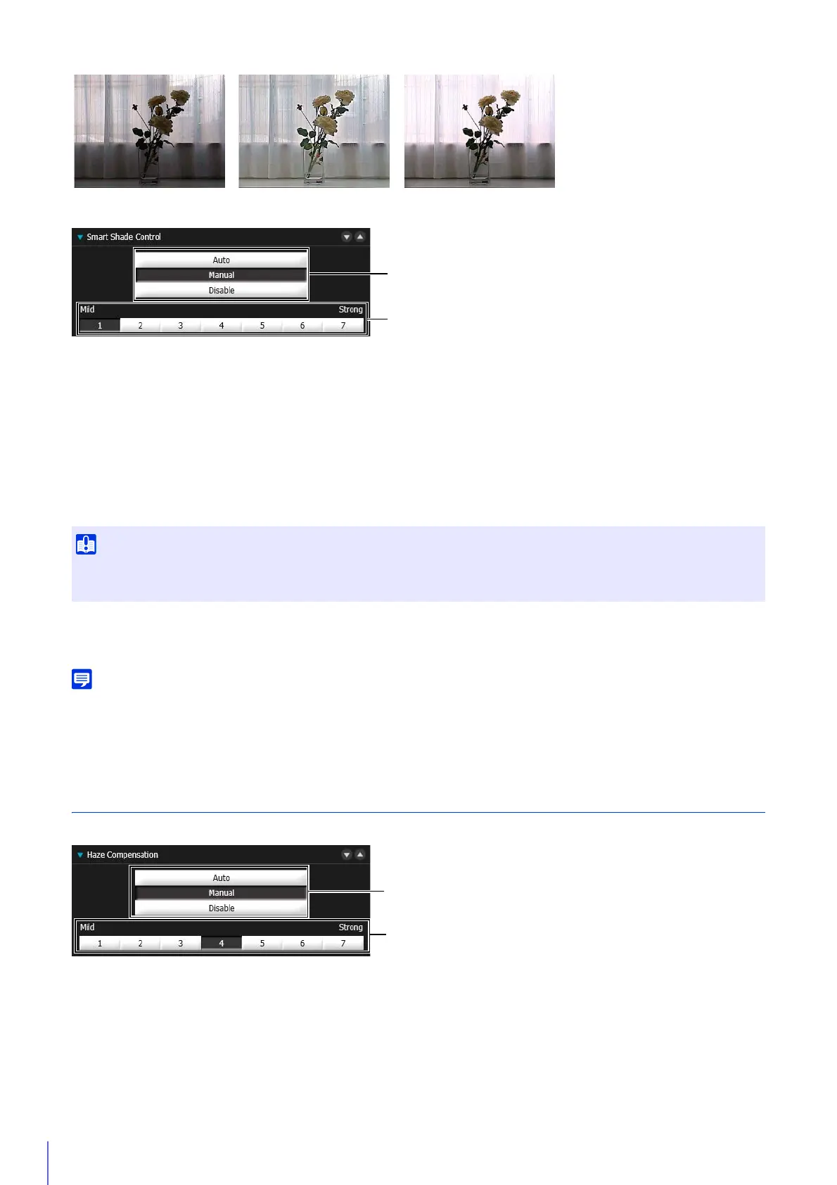 • When [Manual] is selected for Smart Shade Control, setting a high compensation level may increase video noise. If noise is noticeable,