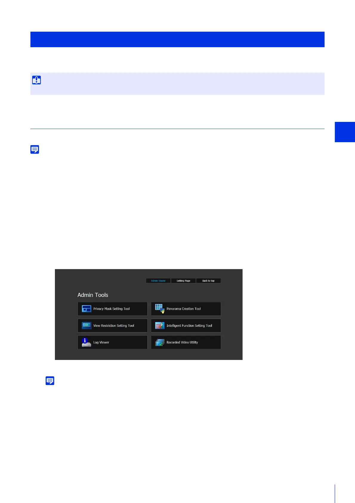 • The Privacy Mask Setting Tool, Panorama Creation Tool, View Restriction Setting Tool and Intelligent Function Setting Tool cannot be