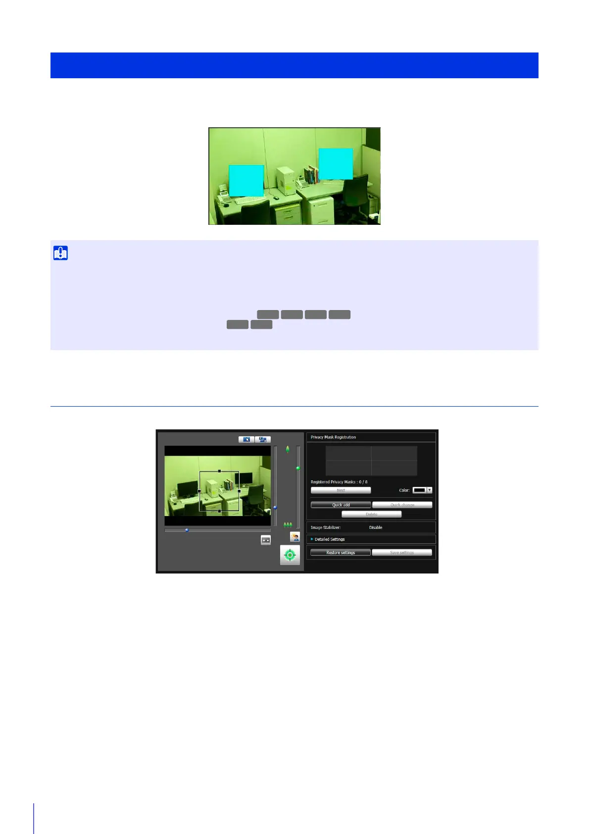 • Privacy masks are applied to all video transmitted from the camera (live video, uploaded video, recorded video and video recorded to