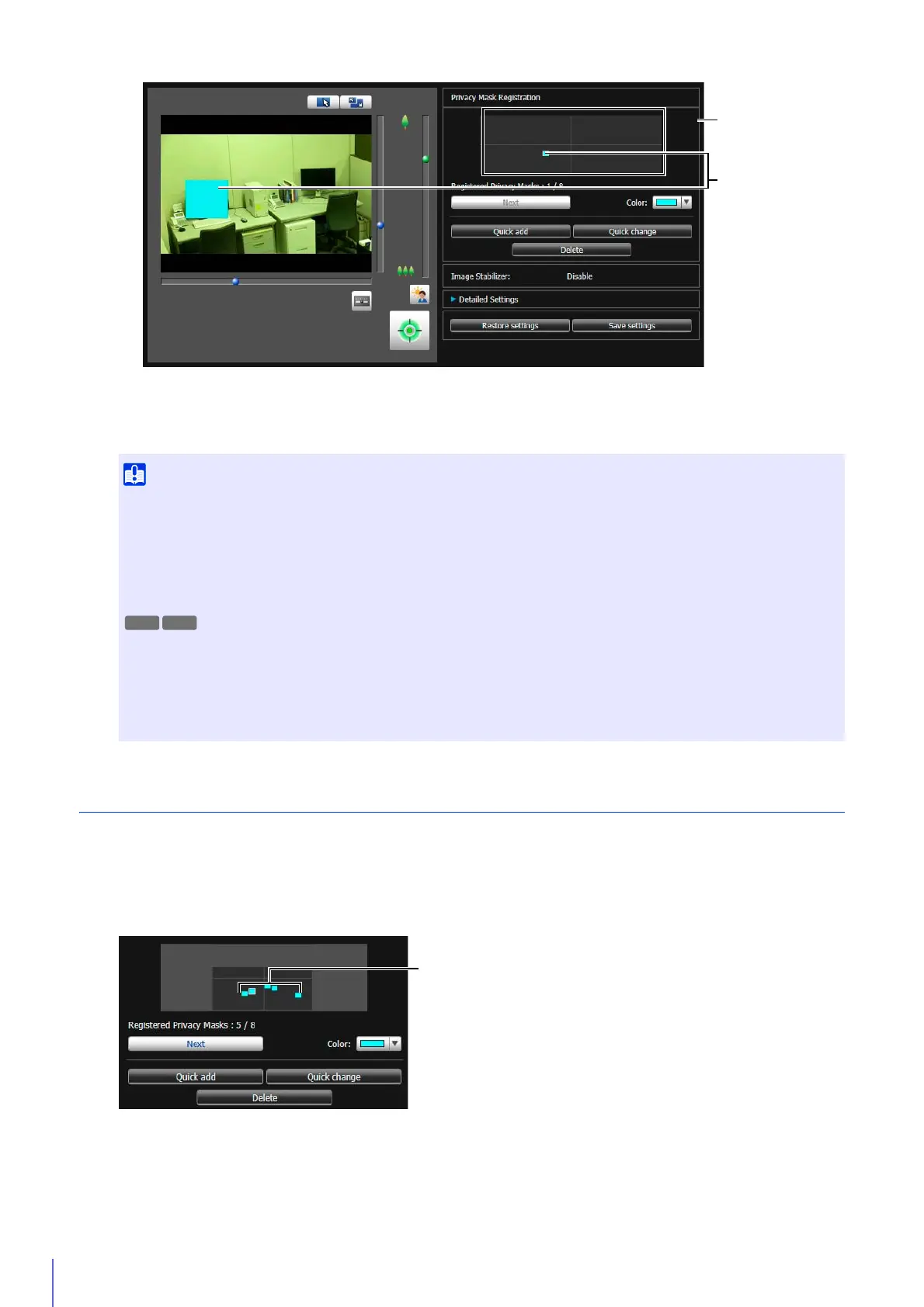 • After registering a privacy mask, pan, tilt and zoom the camera to confirm the areas you want to mask do not become visible