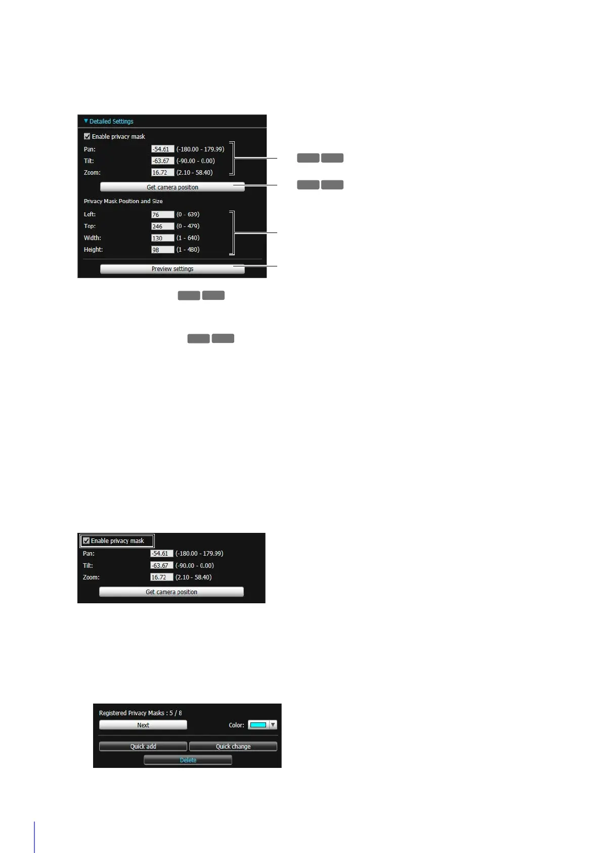The settings for pan, tilt and zoom appear here if you saved privacy masks using [Quick add] or clicked [Get