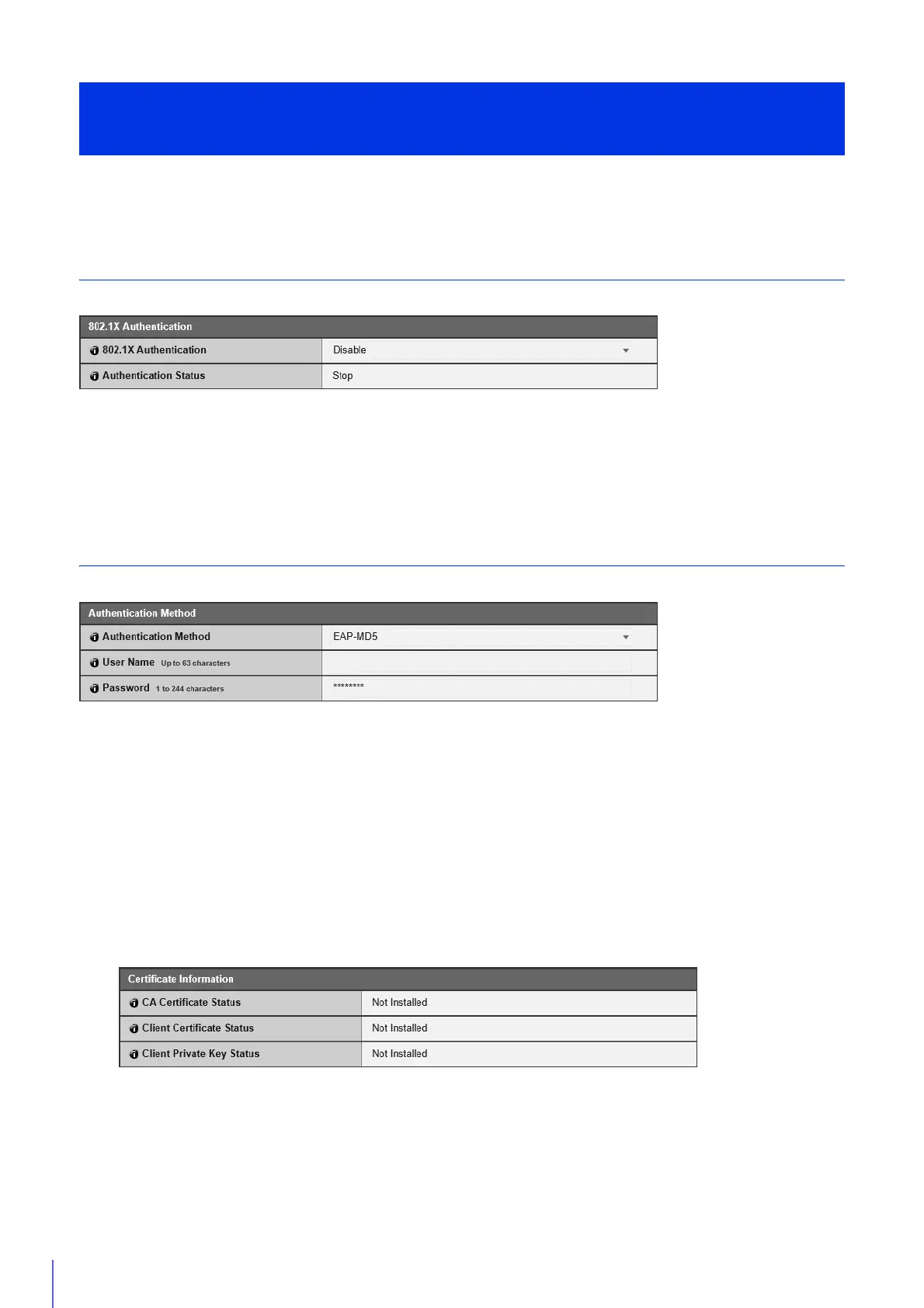 Settings for 802.1X authentication and authentication status display, and for certificate administration.