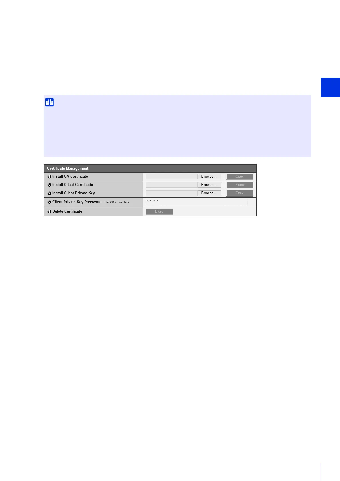 • Client certificates and client private keys are checked as a pair when installing, and an error occurs if they do not match.