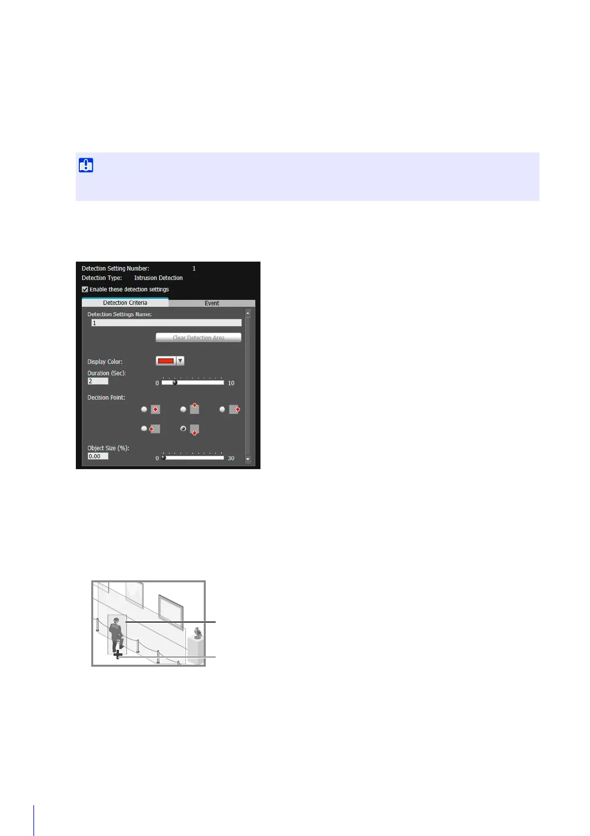 Use the video display area to configure the area where you would like to detect intruding objects (P. 219).