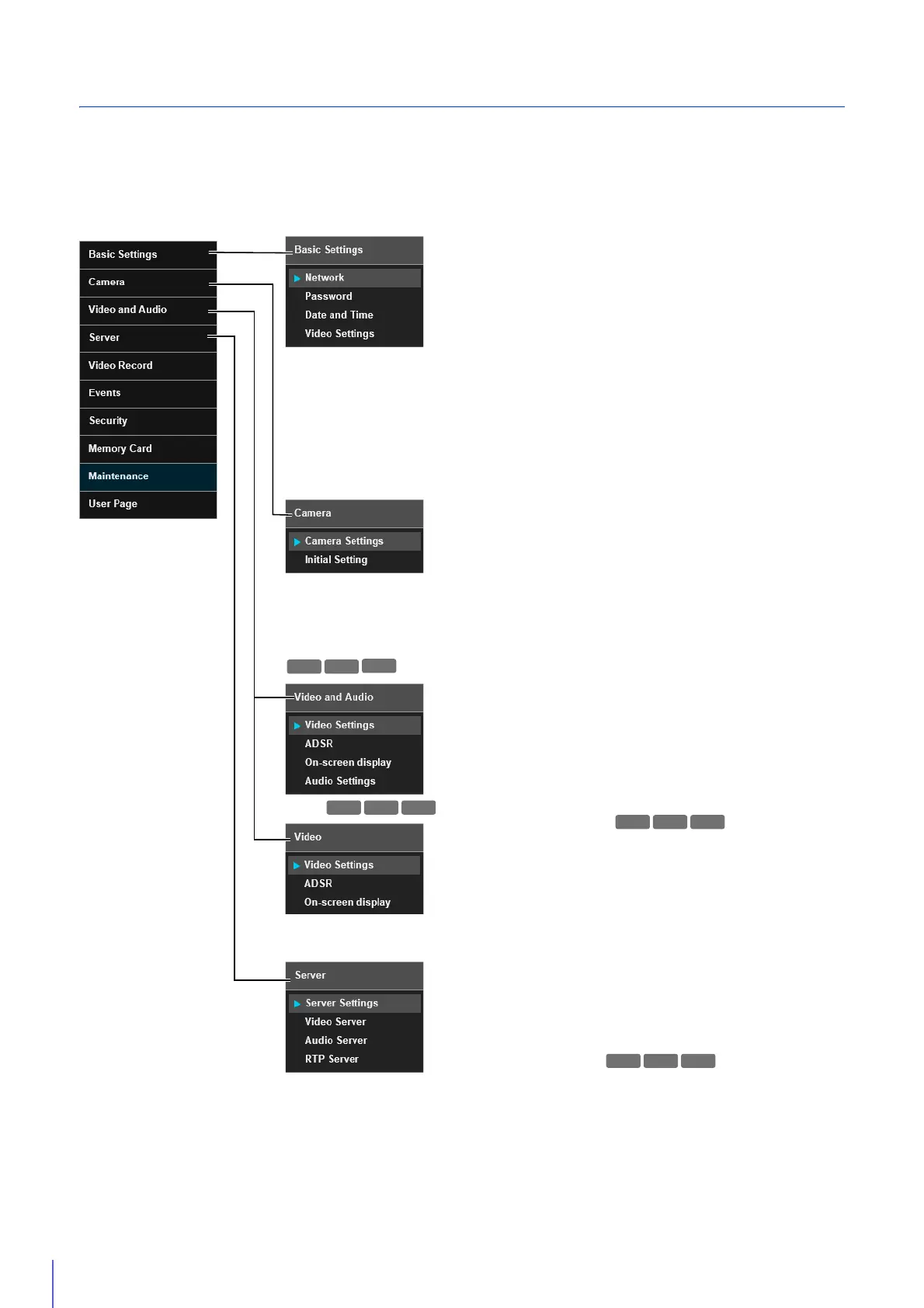 Each of the [Basic Settings], [Video and Audio]/[Video], and [Video Record] menus has a [Video Settings] submenu, but