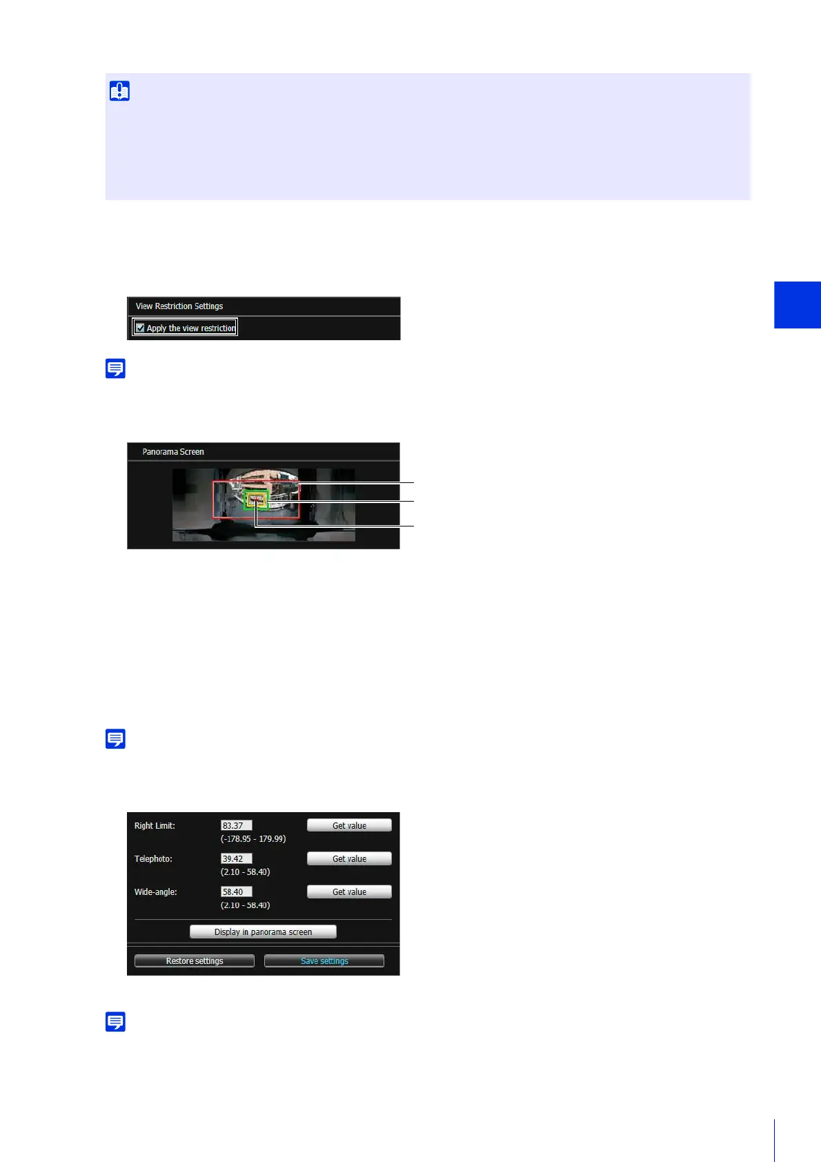 The panorama screen may be slightly different from the actual image. After you have configured view restrictions, be sure to use the
