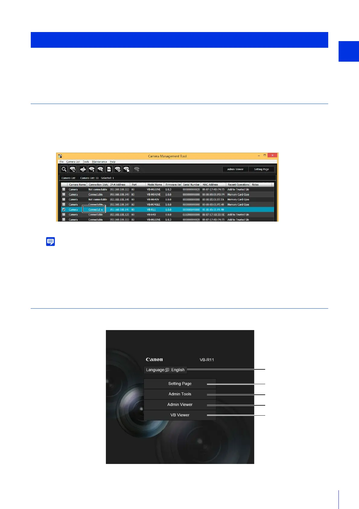 • You can also launch the camera top page by entering the IP address configured with the Camera Management Tool (P. 37)