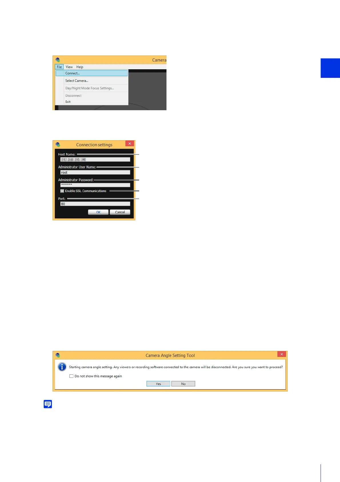 Enter the host name or IP address of the camera (P. 37).