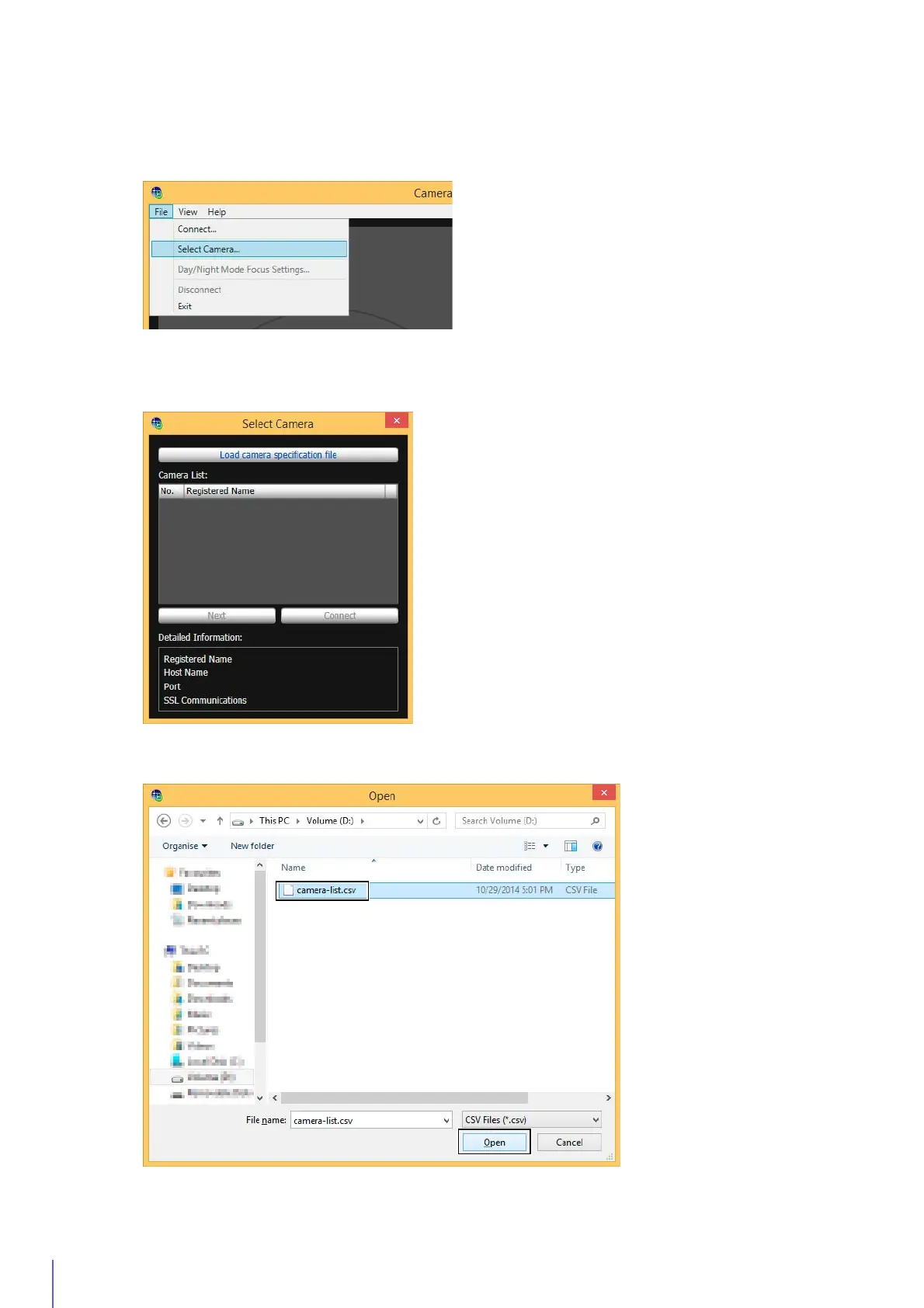 You can connect to a camera by loading camera information listed in a camera specification file (P. 56).