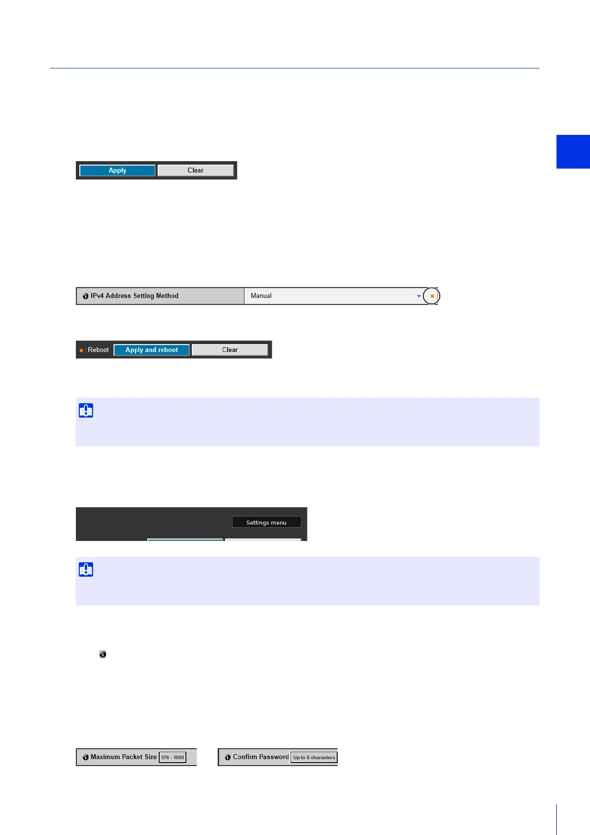 Setting changes will be lost if you navigate to another Setting Page without clicking [Apply] or [Apply and reboot]. Be sure to click