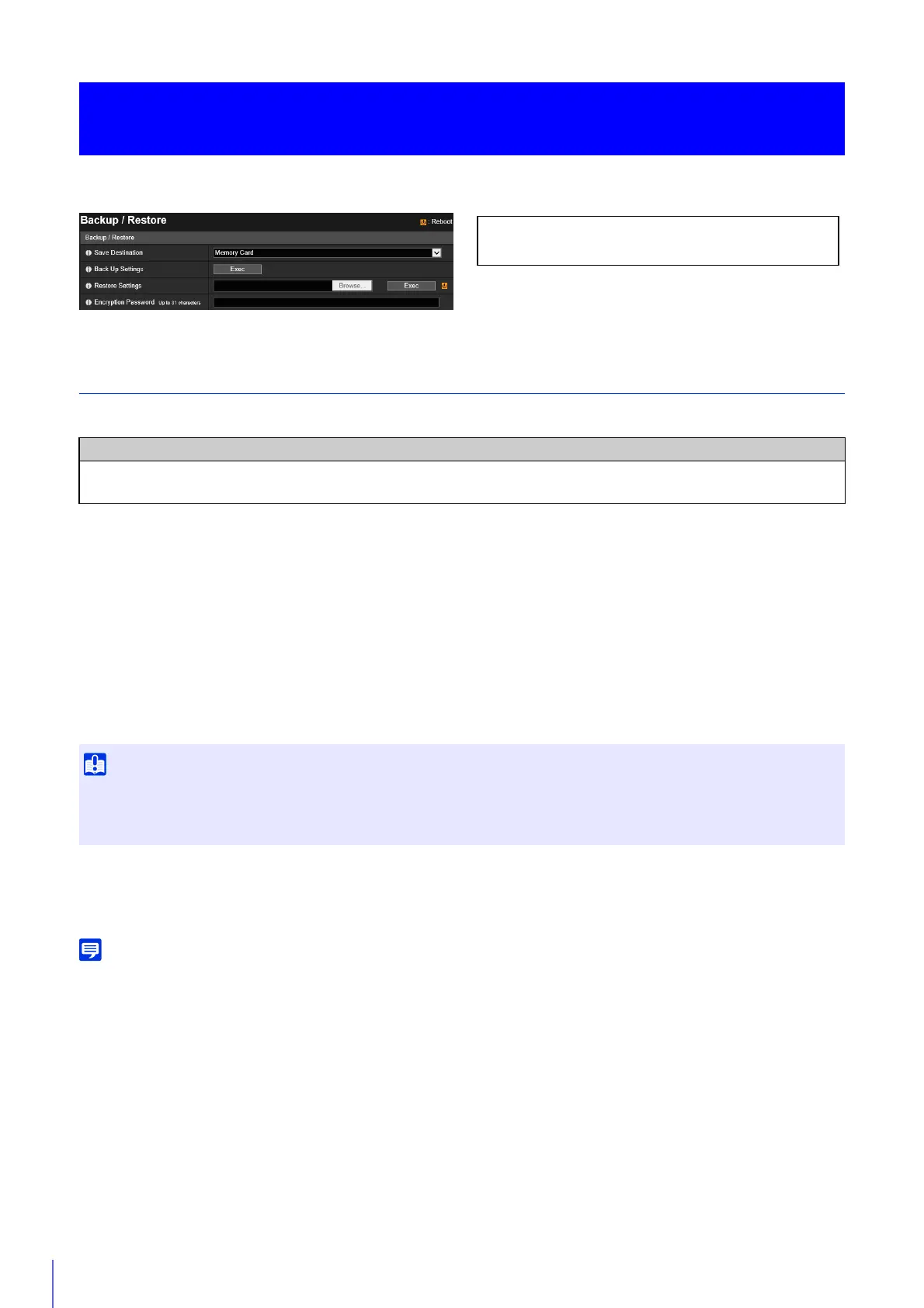 All settings, except date and time, will be backed up. The administrator account, certificates used by SSL/TLS and 802.1X