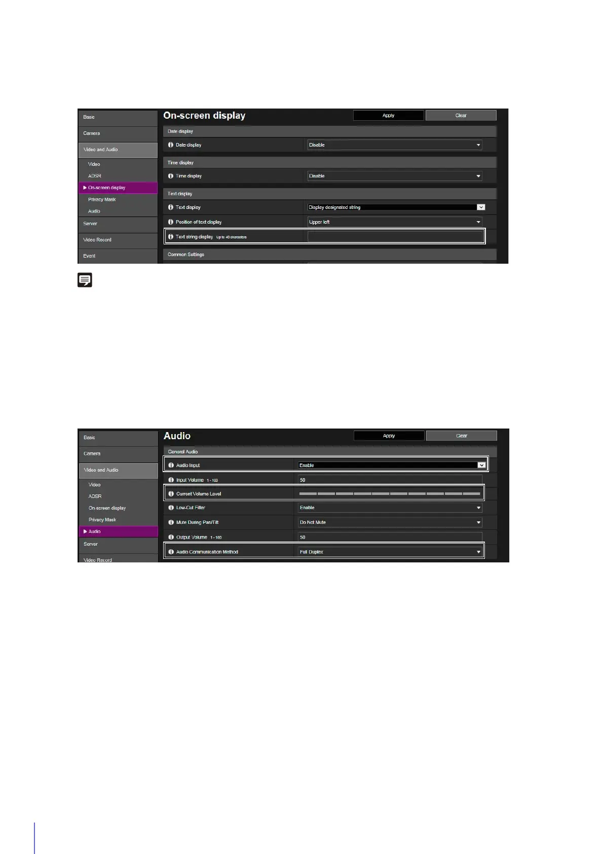 input such as [Audio Server] > [Audio Transmission from the Camera] or [Event] > [Audio Detection] > [Volume