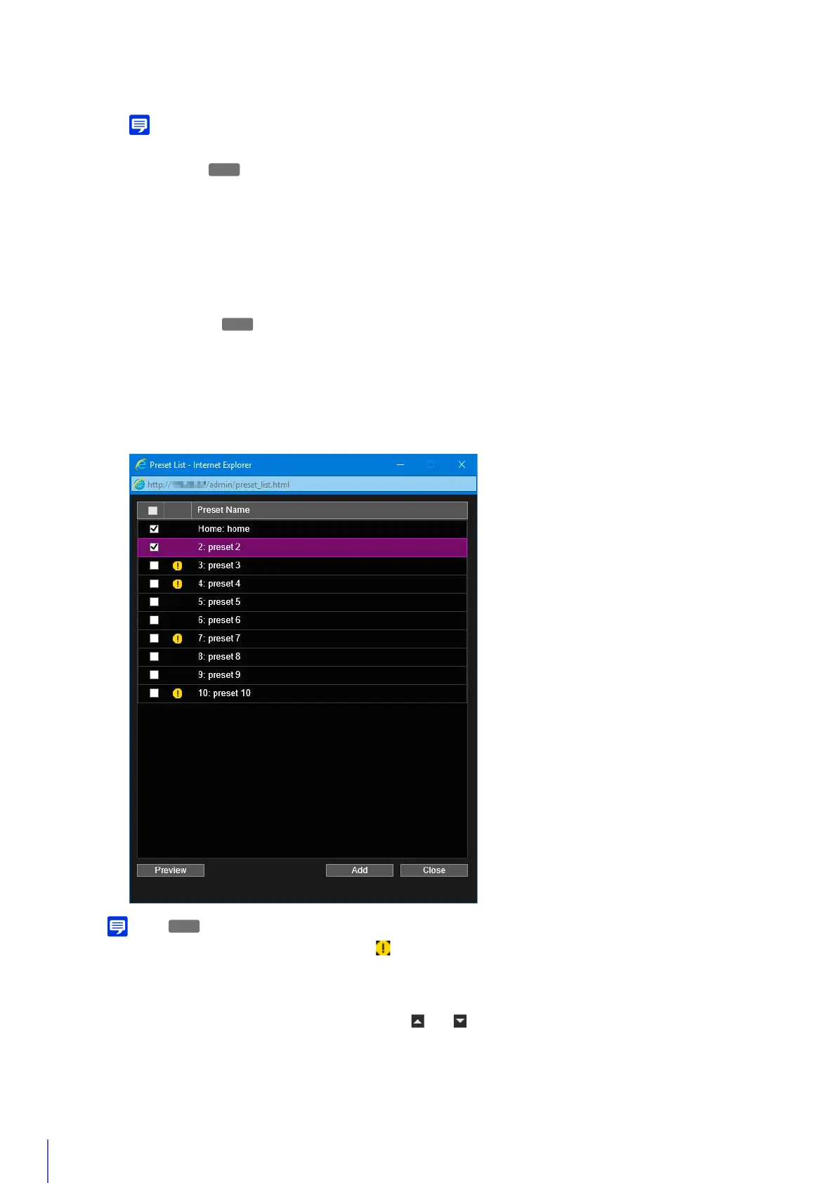 If the preset position is outside the restrict view area, (a warning icon) is displayed on the left.