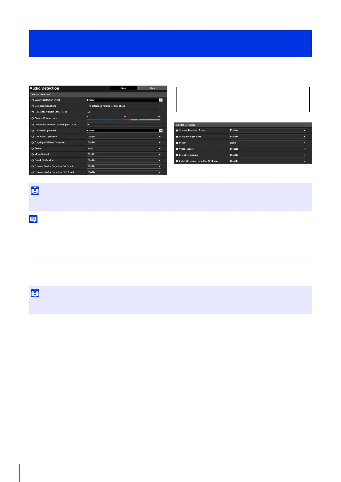 You can check the audio detection status on the [Event and Input/Output] menu of the Camera Viewer (P. 73).