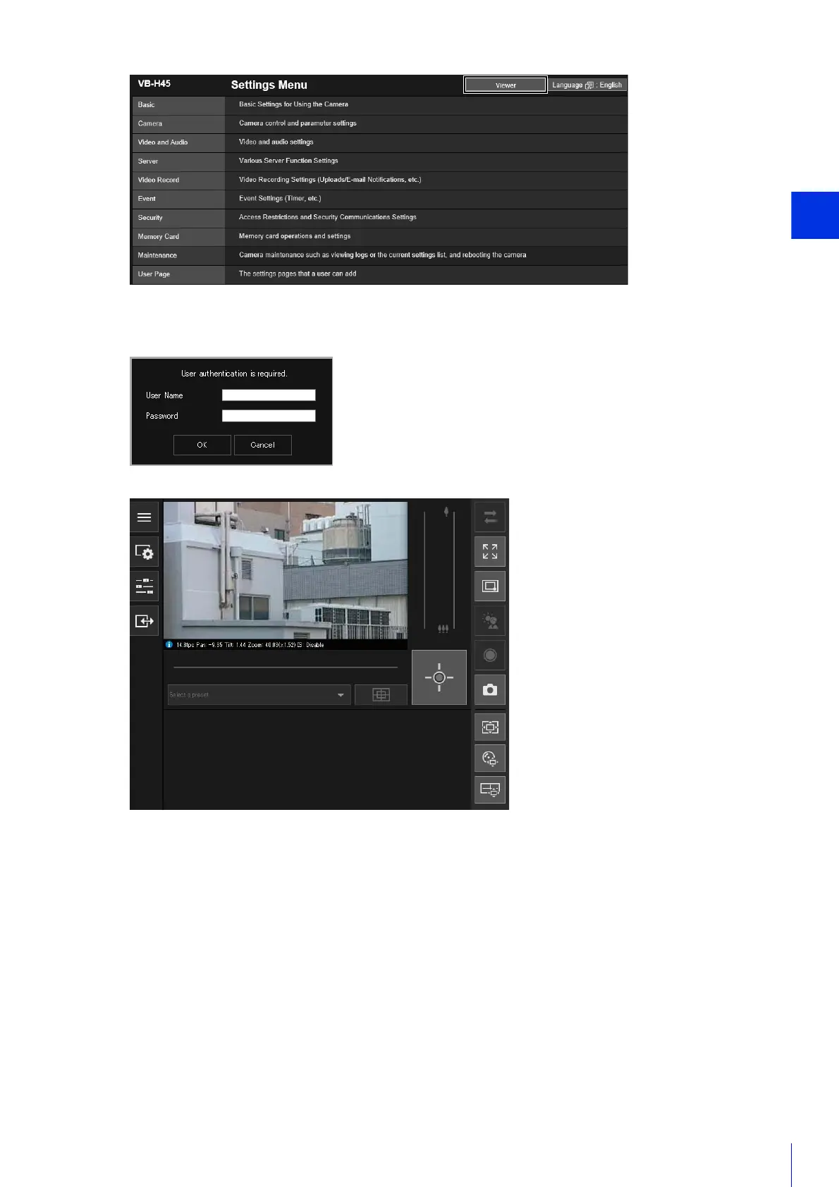 When you use the Viewer and the Setting page, an authentication screen is displayed, and you are prompted to enter