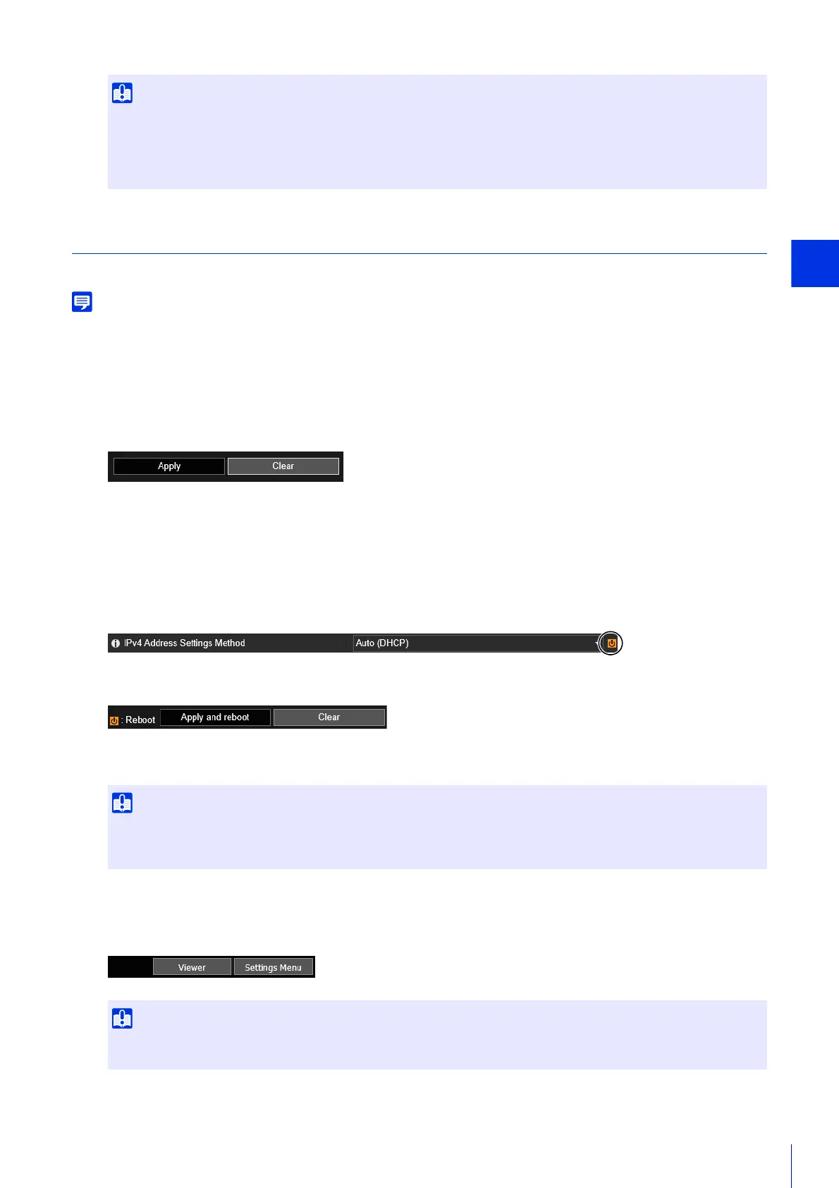Setting changes will be lost if you navigate to another Setting Page without clicking [Apply] or [Apply and reboot]. Be sure to click