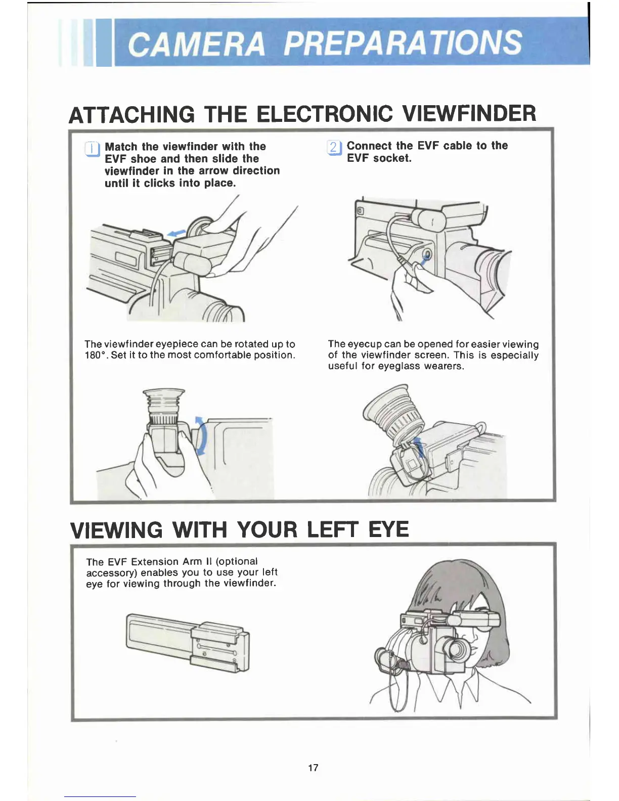Canon VM E 2 - Camera Preparations; Attaching the Electronic Viewfinder; Viewing with Your Left Eye