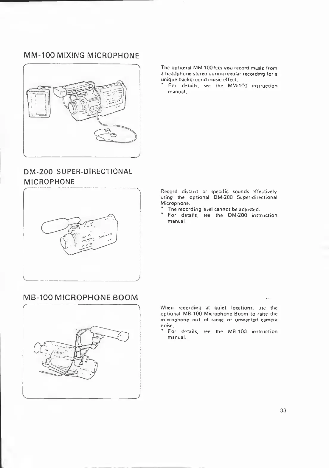 Canon VM-E70 - OPTIONAL MICROPHONES; MM-100 Mixing Microphone; DM-200 Super-directional Microphone; MB-100 Microphone Boom